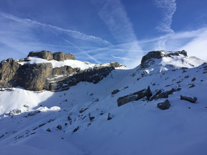 Die Abfahrt nach Norden vorbei am Rupperslaui-Stöckli fährt sich noch gut, wenn auch der Schnee langsam schwer wird und teilweise windgepresst ist. Das Spurenbündel führt derzeit östlich vorbei an Punkt 2057 durch steiles, felsduchsetztes Gelände, Richtung Alpeli. Ab Chüestein bis Sutterlis Hütte wird es dann eher ruppig. Von Höchi dann auf harter, unebener Harschkruste bis Chäppeliberg.