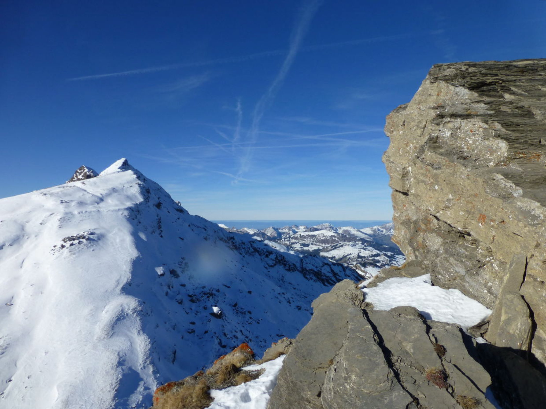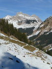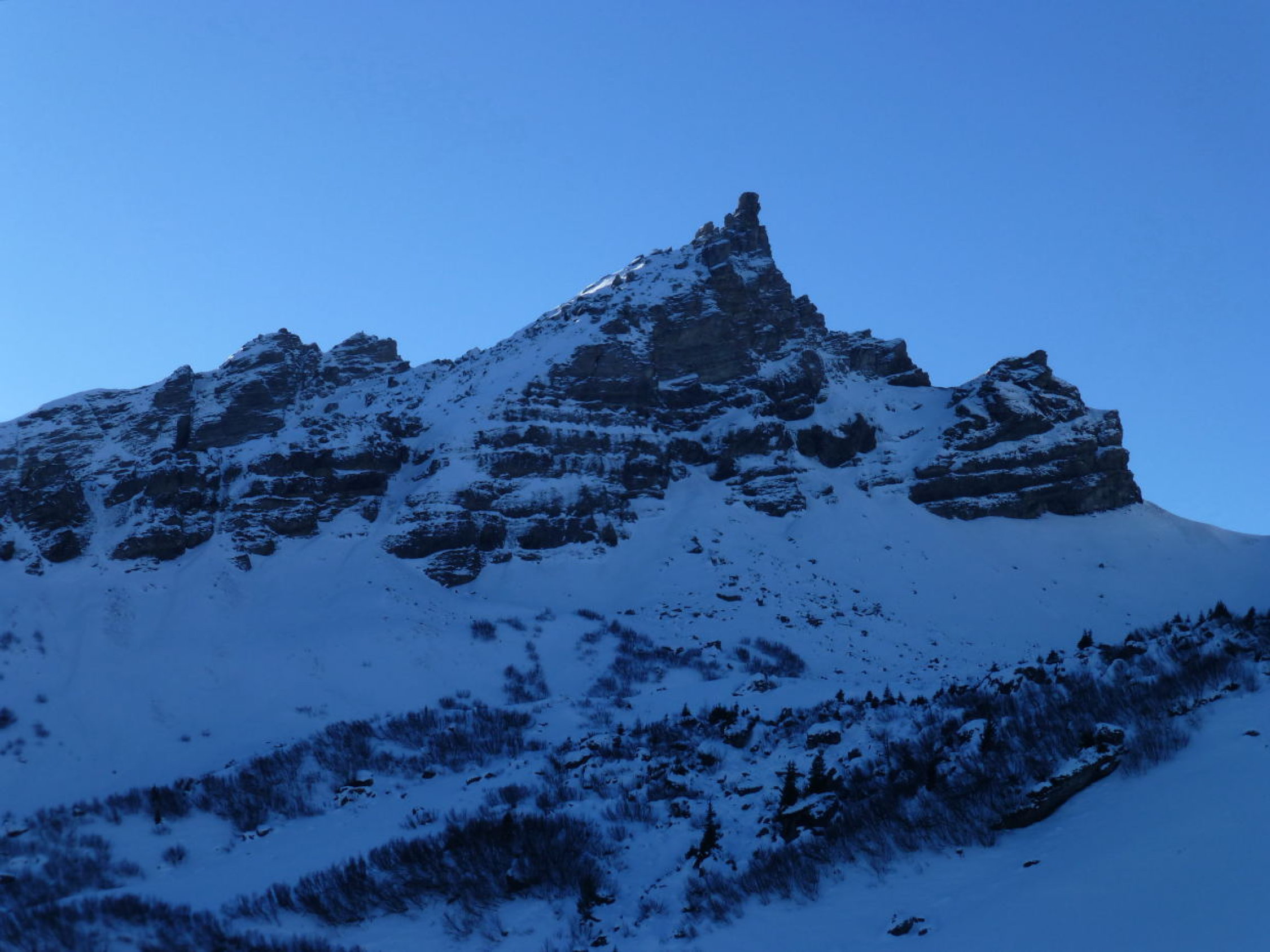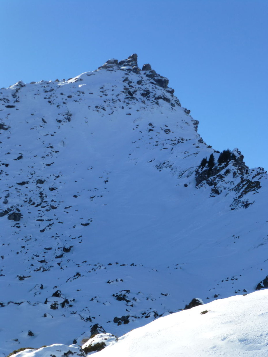 Mit Schleierwolken sonnig und mild. Schnee ab ca. 1200m: unten verregnet und hart bzw. vereist, oben ca. 10cm z.T. verblasener Pulver auf guter Unterlage, dazwischen z.T. Bruchharsch. Im Couloir Trittschnee. Unterhalb La Molaire und zuunterst auf beiden Fahrstrassen kurze Tragpassen.