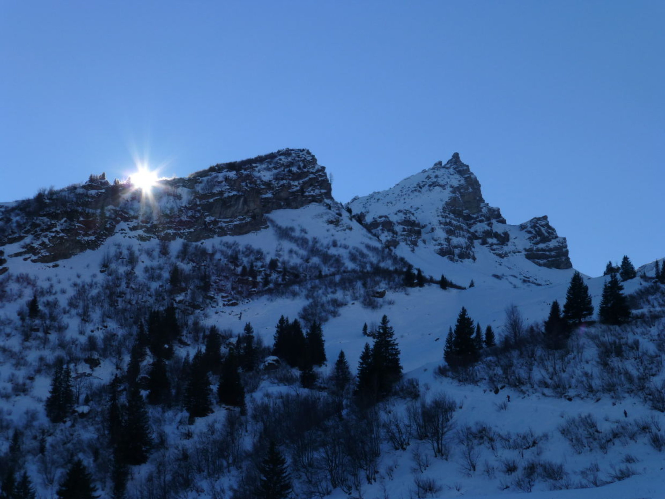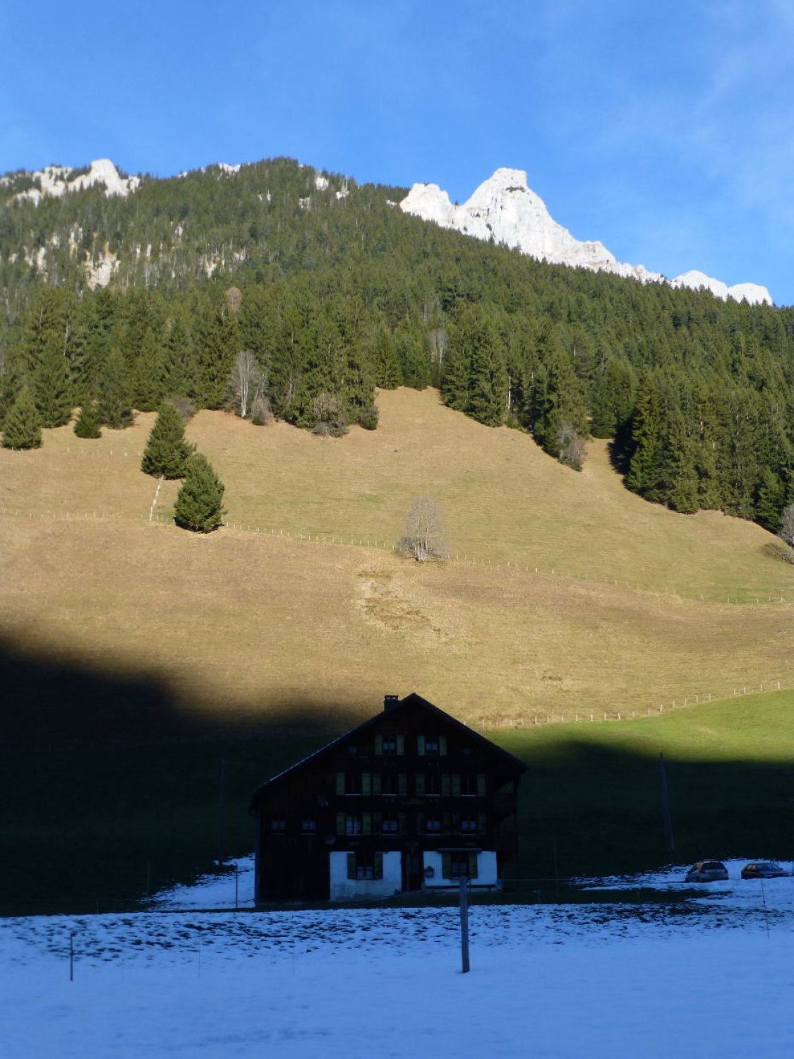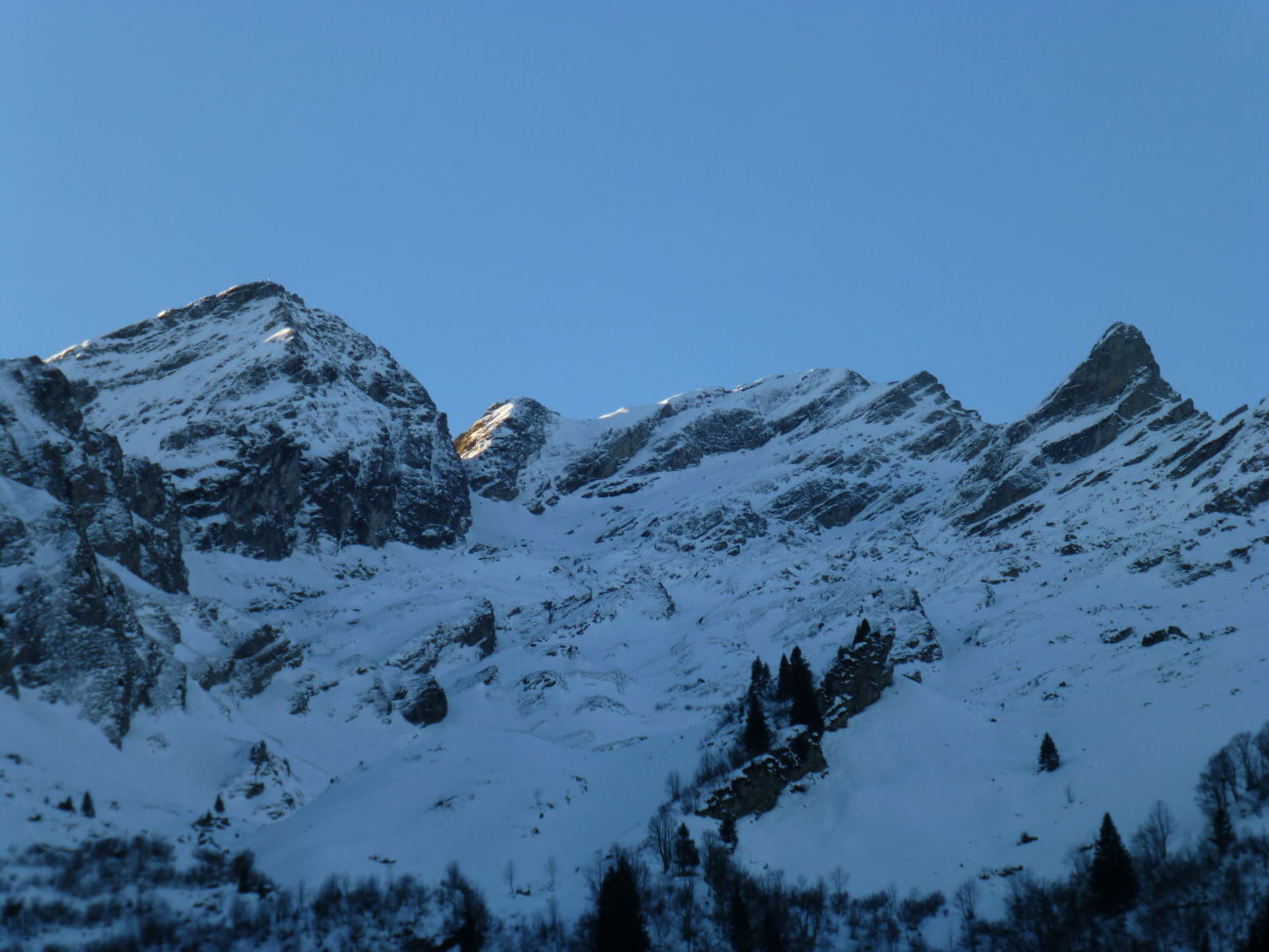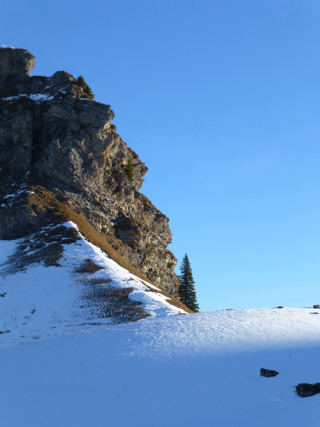Mit Schleierwolken sonnig und mild. Schnee ab ca. 1200m: unten verregnet und hart bzw. vereist, oben ca. 10cm z.T. verblasener Pulver auf guter Unterlage, dazwischen z.T. Bruchharsch. Im Couloir Trittschnee. Unterhalb La Molaire und zuunterst auf beiden Fahrstrassen kurze Tragpassen.