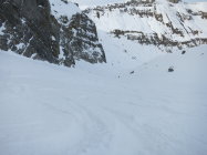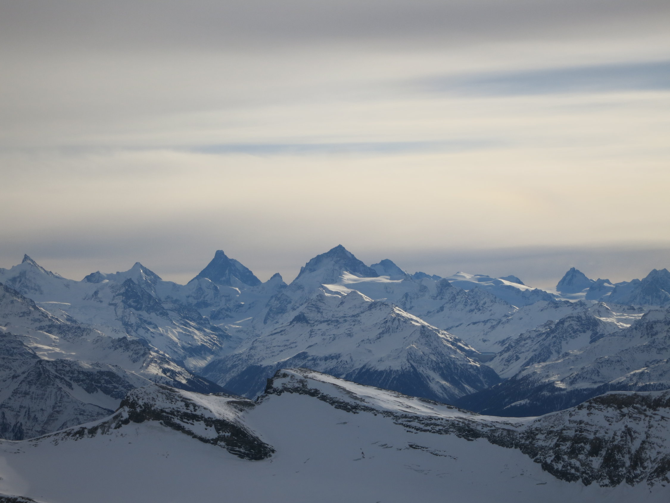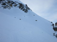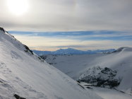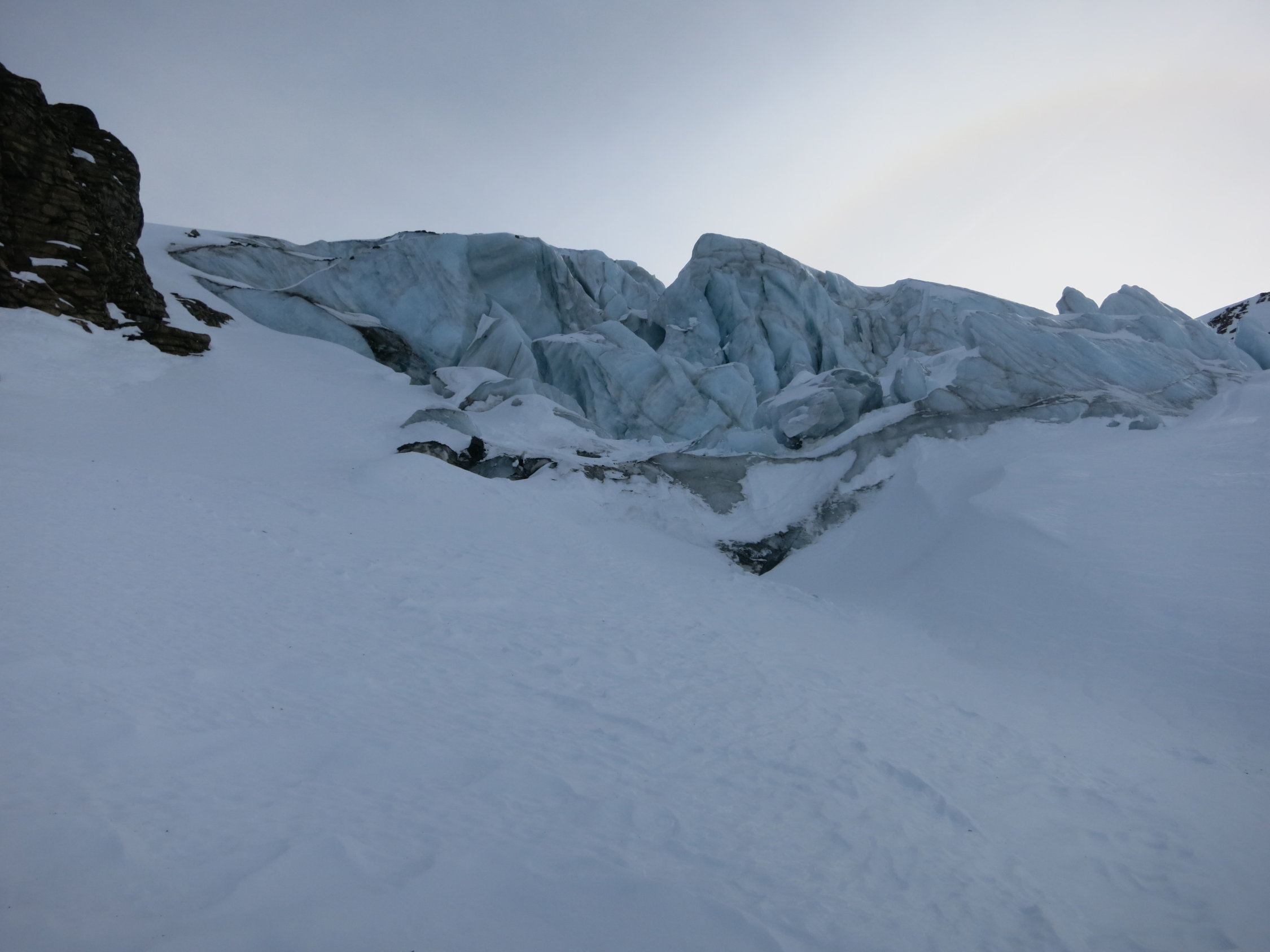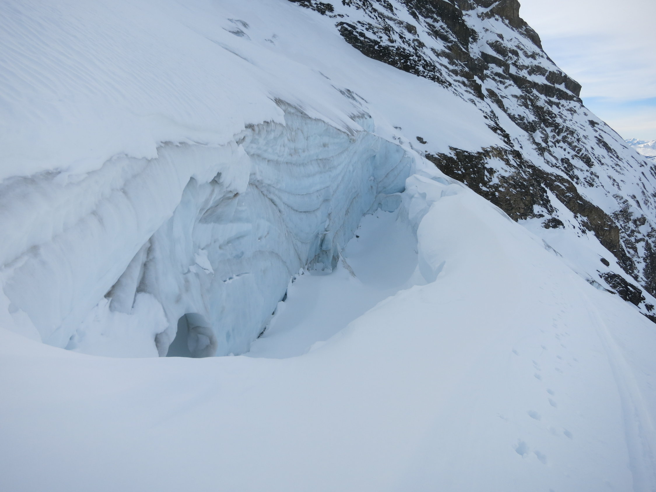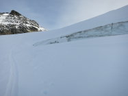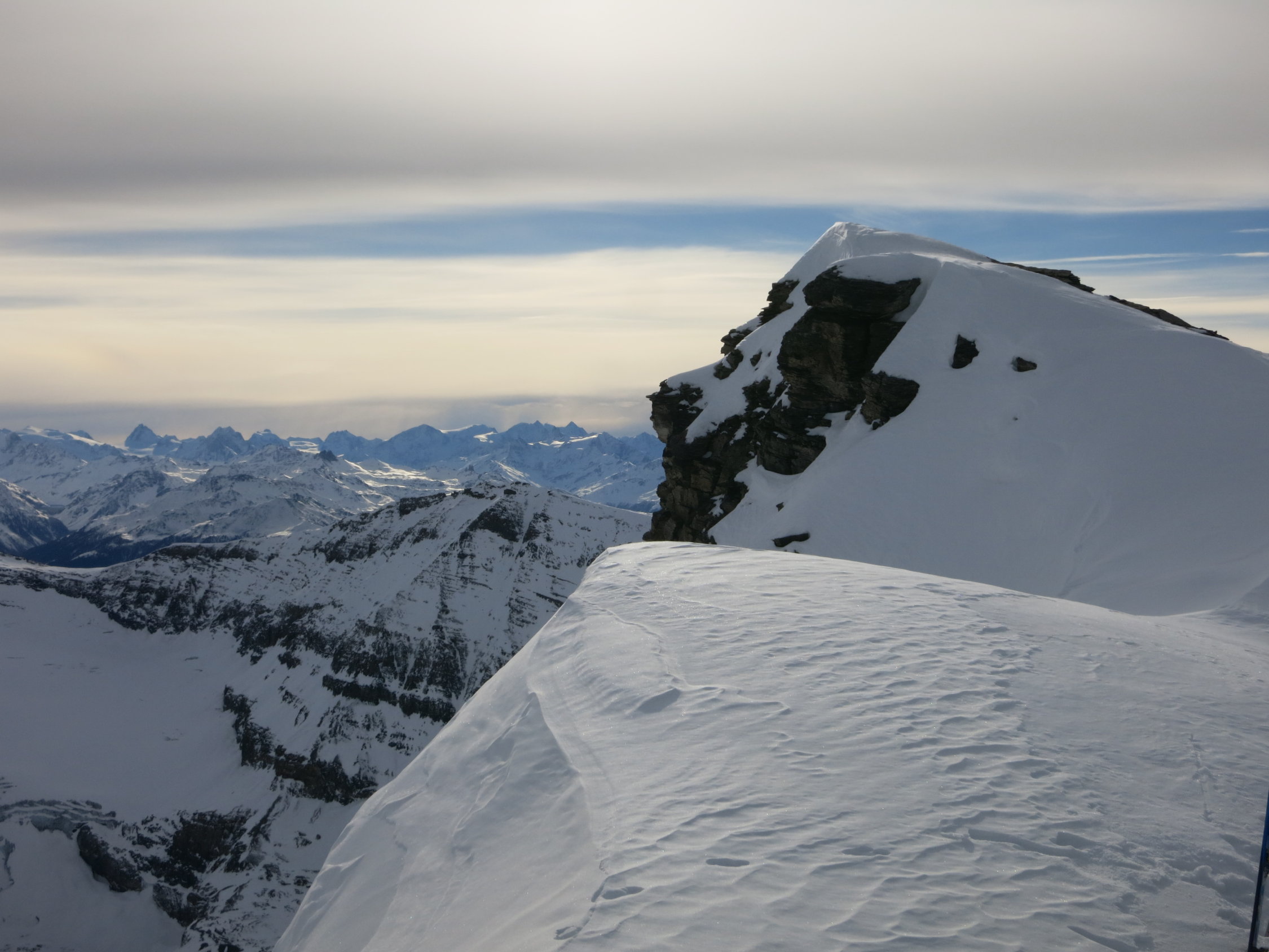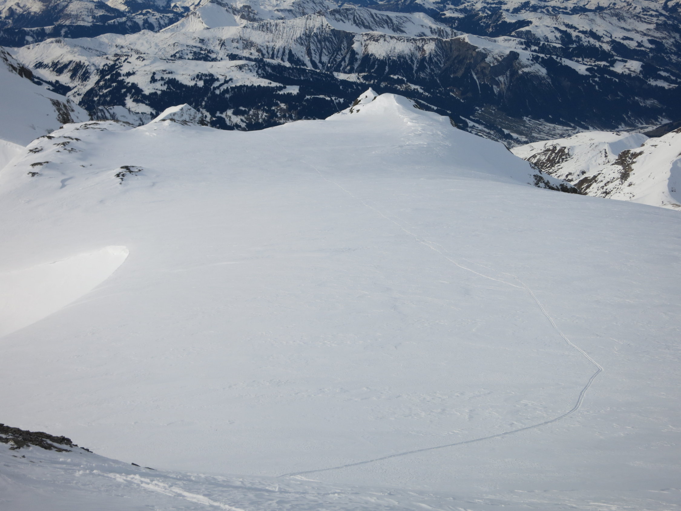 Gute Spur bis zum Gipfel. Diesmal nicht über die "Rampe" sondern mit einigen Spitzkehren über den linken Rücken. Frühstücksplatztraverse gut zu gehen. Pulver auf der ganzen Abfahrt. Selbst das Gipfelplateau war ausnahmsweise nicht abgeblasen. Sehr wenig Leute unterwegs. So leer habe ich es hier noch nie erlebt. Keine Spuren von der Lämmerenseite gesehen. Recht grosse und offene Spalten auf dem Gletscher. Der Sommer lässt grüssen. Ansonsten braucht es schnell neuen Schnee. Südseite der Niesenkette ist fast aper :-(