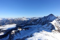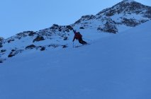 Zuoberst, dem E-Grat entlang bis zur Lücke, kann vermutlich nicht mehr lange abgefahren werden, da dort die wärmende Sonne ganze Arbeit verrichtet. In der schattigen Nord- und Nordostseite würde ich die Verhältnisse mit "Piste gut, Pulver/hart" bezeichnen.