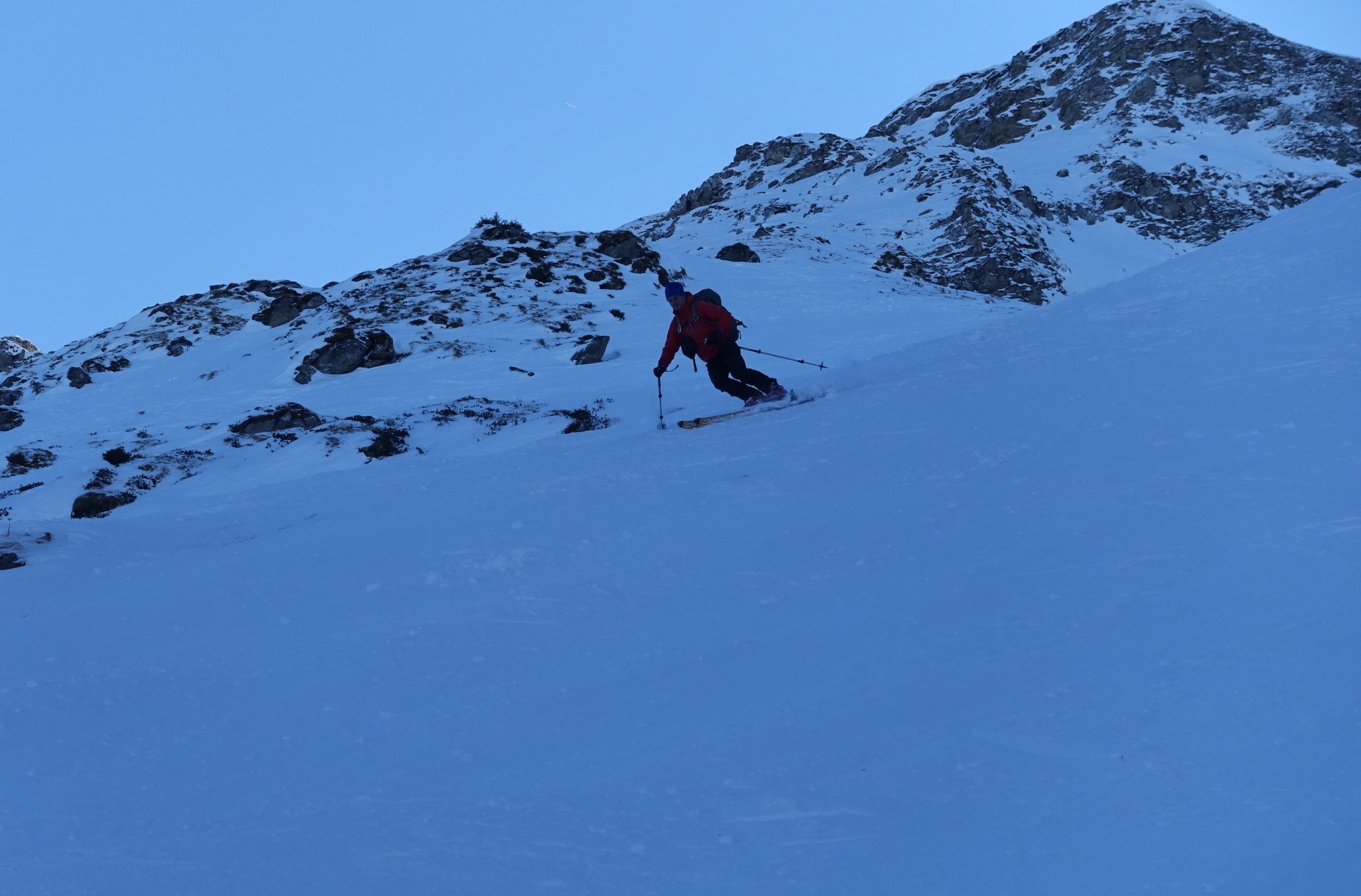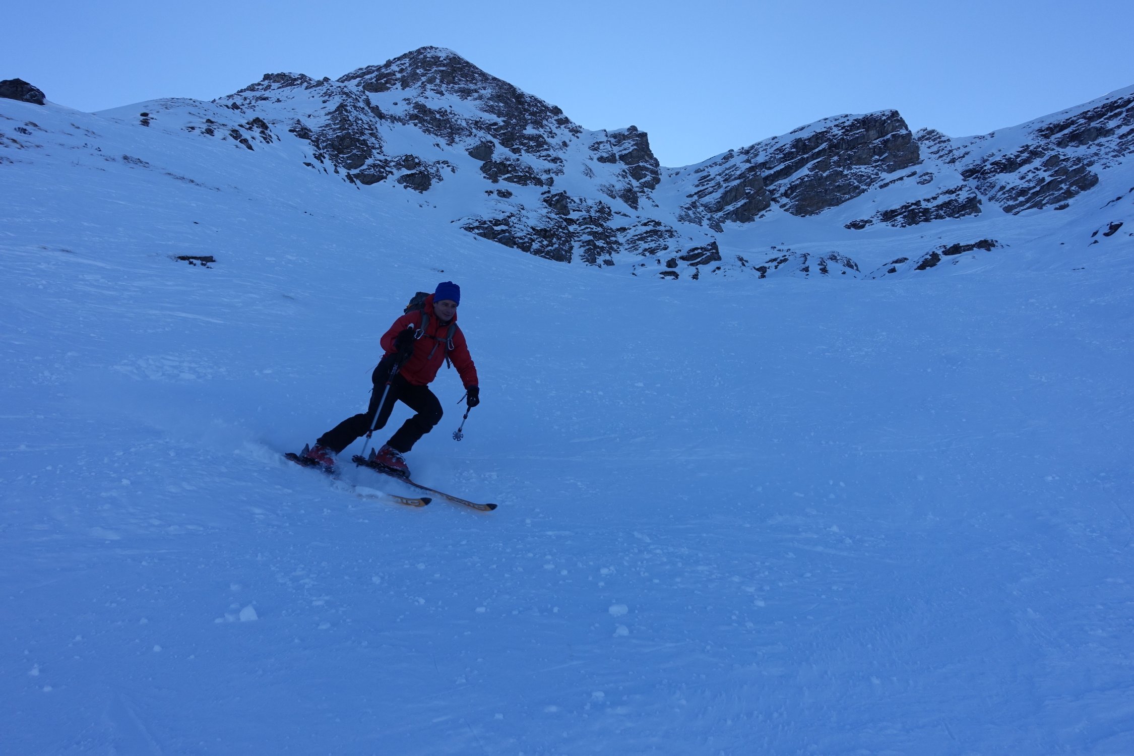 Abfahrt dann über die NE Seite zum Lac Lioson bei pistenähnlichen Verhältnissen. Im oberen Teil ist sogar herrliches Buckelpistenfahren angesagt!