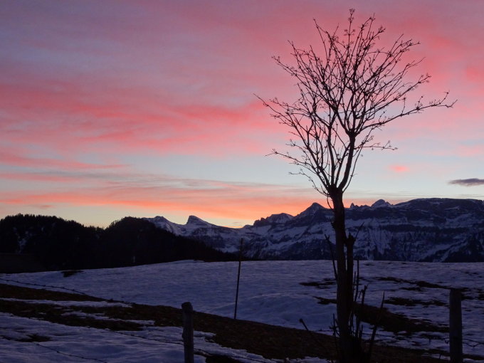 Wie aus Steinböcke Wolken werden. Mein Ziel war früh zu starten um als erster bei den Steinböcken zu sein. Der erste Teil klappte, ich war während der ganzen Tour der Erste und alleine. Steinböcke: als ich nach Oberberg zum grossen Hang hinauf kam, sah ich oben am Grat mein alter Bekannter, der grosse Steinbock, der flankiert von weiteren Tieren zu mir hinunterschaute. Die Vorfreude auf schönen Bildern dauerte kurz. Nach zwei Sicherheitsbilder aus grosser Distanz, sah ich mein Steinbock hinter dem Grat verschwinden und ward nicht mehr gesehen. Der hat sicher gedacht: Nicht schon wieder der "mazeno", der soll mich in Ruhe lassen! Er hat sich durch einen jüngeren Bock und Steingeissen mit Jugend vertreten lassen. Die Enttäuschung dauerte nur kurz, der Trost war schon da in Form von wunderbaren, grossen Wolken die die Alpenkette überfluteten in einem dramatischen Schauspiel. So habe ich die davongelaufenen Steinböcke sein lassen und mich auf die Wolken konzentriert. Eine fantastische Stimmung. Man hat nicht immer Pech.