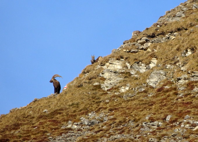 Wetter trocken, zuerst sonnig, ab ca. 0900 rasche Bewölkungszunahme aus SW. Am Gemmenalphorn war meist sonnig. Auf dem Grat mässiger, zunehmender SW Wind.Aus diesem Grund verschwanden die Steinböcken im Windschattenhang auf der Justistalerseite.