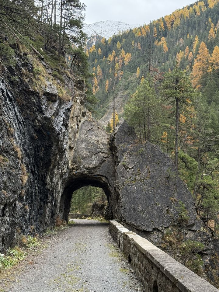 Einfache Wanderung durch die imposante Zügenschlucht unterhalb Silberberg, T2, ÖV Tour. Start Station Monstein RhB 9.15 Uhr (alle Stunden Verbindung von Filisur und Davos. Auf der alten breiten Kantonsstrasse alles entlang der Landwasser, einige wenige Tunnel bis kurz vor Station Wiesen RhB. Unterwegs Abzweigung Wanderweg zum Bergwerk Silberberg und nach Jenisberg 1503 m.