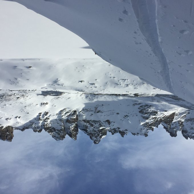 ca 15cm Neuschnee vom Mittwoch, bis 2300m Schneedecke durchfeuchtet. Gipfelhang ein wenig abgeblasen aber dennoch erstaunlich guter gesetzer Pulver.