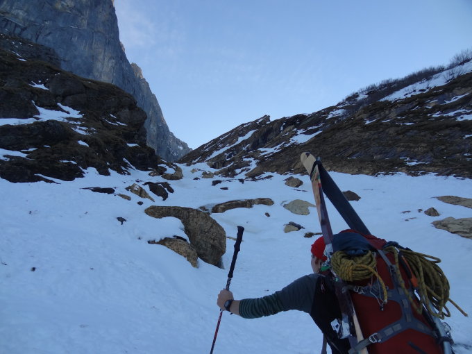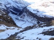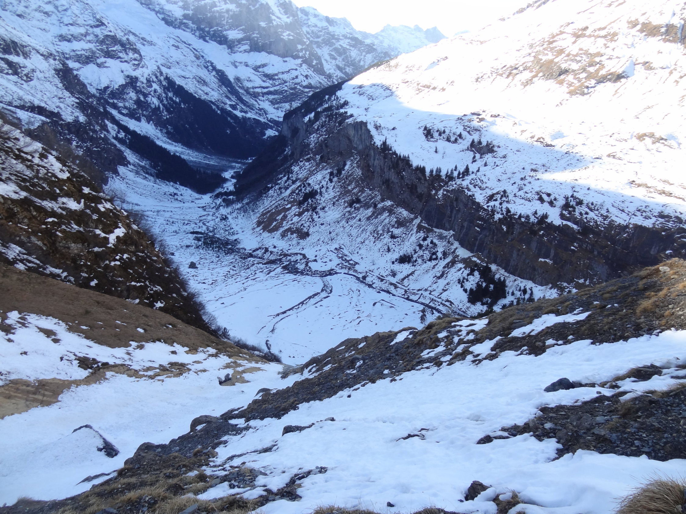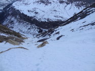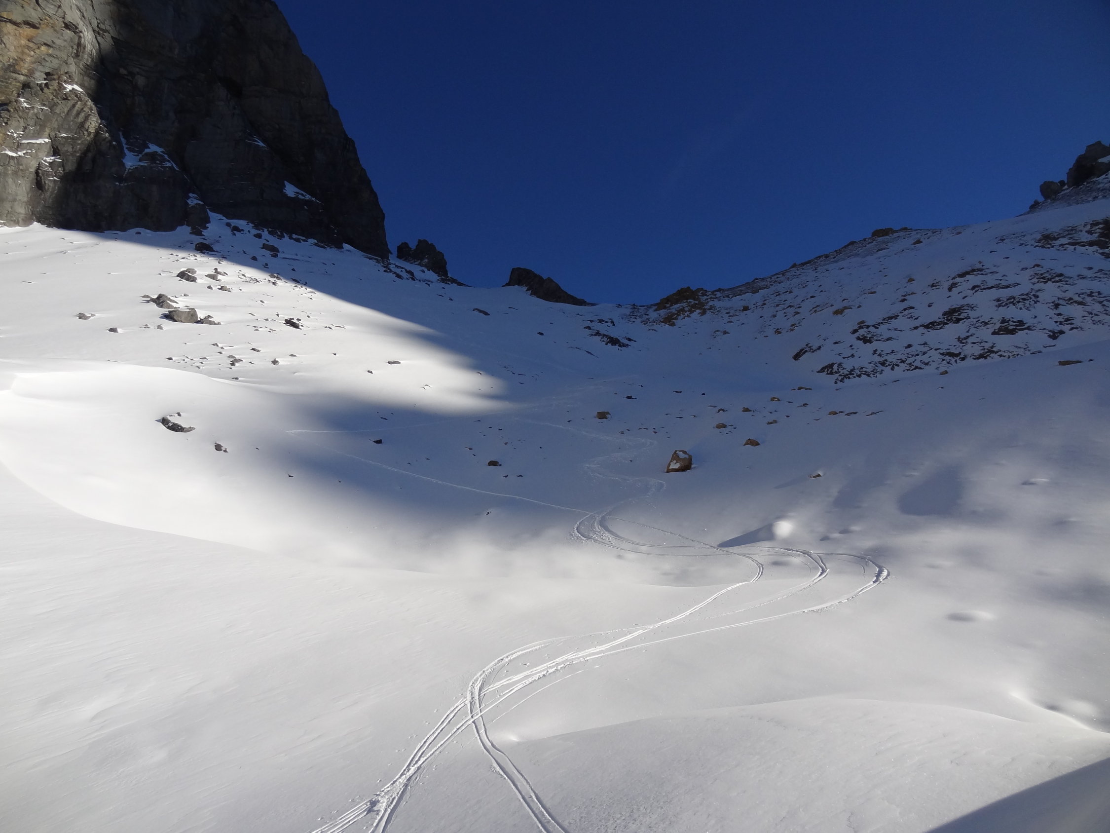 In der Abfahrt konnte der oberste Teil des Couloir unterhalb der Spannorthütte gefahren werden. Jedoch mussten dann unten raus auch im Abstieg die Ski ca. 200 Hm gebuckelt werden.