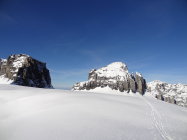 Ab der Spannorthütte gute Verhältnisse und genügend Schnee, meist oberflächlich gefrorener Harschdeckel, kurz vor der Schlossberglücke jedoch noch ca. 200 Hm einigermassen pulvrig und sehr schön zu fahren. Abstieg von der Lücke auf den Gletscher problemlos, kurz (20 m), aber steil. Auf dem Gletscher gute Schneeverhältnisse, jedoch noch etwas knapp eingeschneit. Vorsicht auf Spalten.