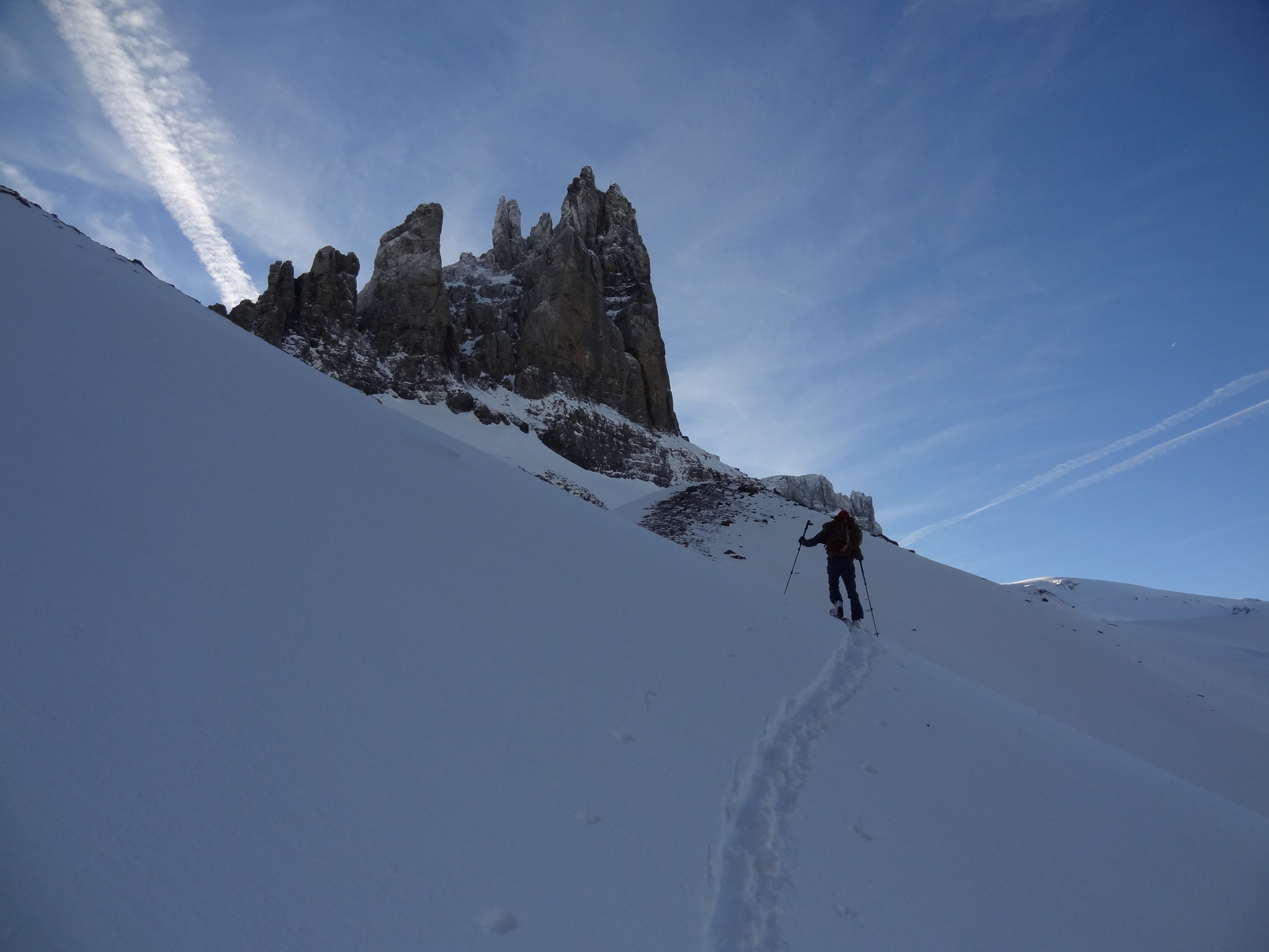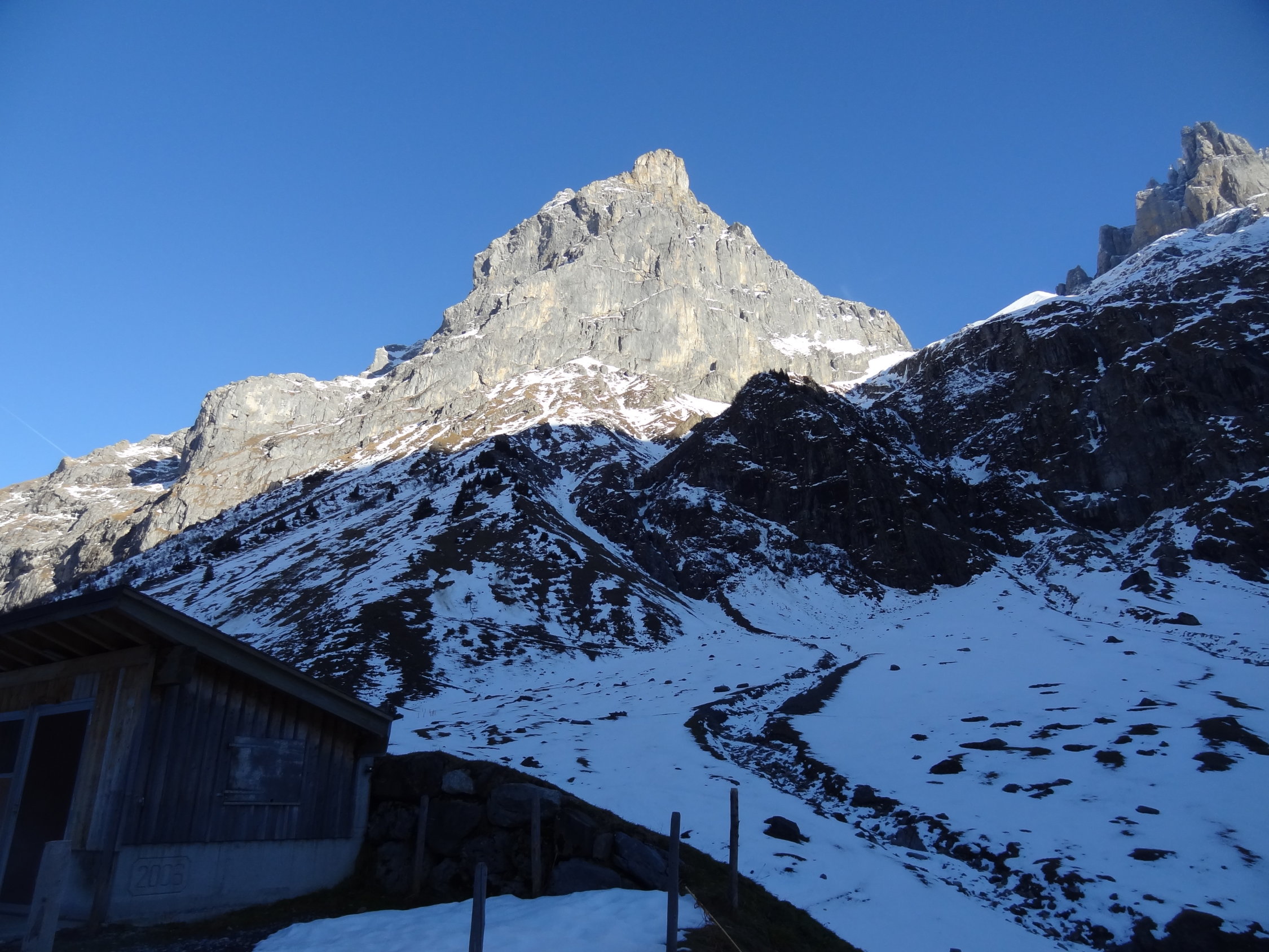 Der Steilhang zur Spannorthütte hinauf hat dann sehr wenig Schnee. Den untersten Teil konnten wir noch mit Ski hochsteigen, dann war ca. 350 Hm Ski buckeln angesagt. Unten raus dem Sommerweg gefolgt, im obersten Teil in direkt durch das Couloir hoch. Der Schnee war in diesem Hang auf der ganzen Länge kaum gefroren - Verhältnisse wie im Frühling. Dementsprechend kräftezehrend und Zeitraubend war der Aufstieg.