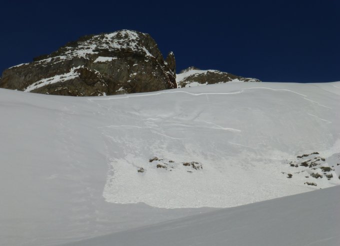 Bei der Abfahrt Richtung Heubergjoch hat mich auf halbem Weg ein Schneebrett links überholt (Aufschubhöhe ca. 2 Meter). Beim Wiederaufstieg gab es einige Setzgeräusche.