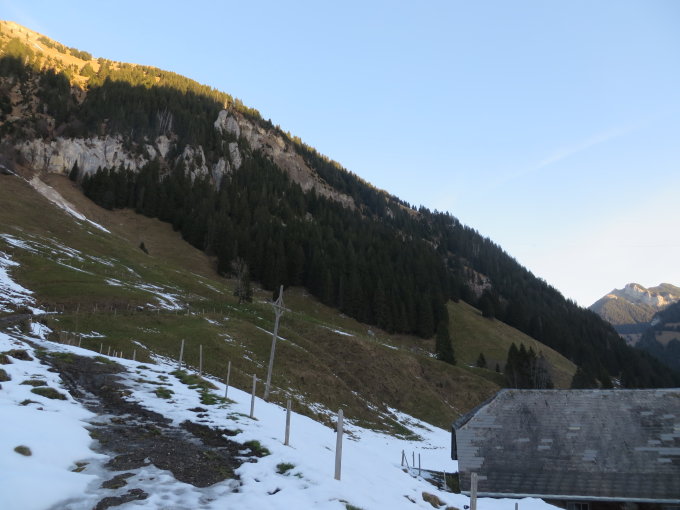 Im unteren Teil des Blau-Weissen Wanderweg haben wir einige kleine Gleitschneelawinen-Kegel gequert, was aber keine Probleme darstellte. Der Aufstieg zur Alp auf Schafschimbrig folgte im Wald und es war alles schneefrei, aber zum teil etwas rutschig, weiter sind wir dann zum Hängst 1809m aufgestiegen und die kleine Stelle (ca. 4m) runtergeklettert, auch das war alles trocken und fest.