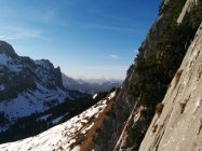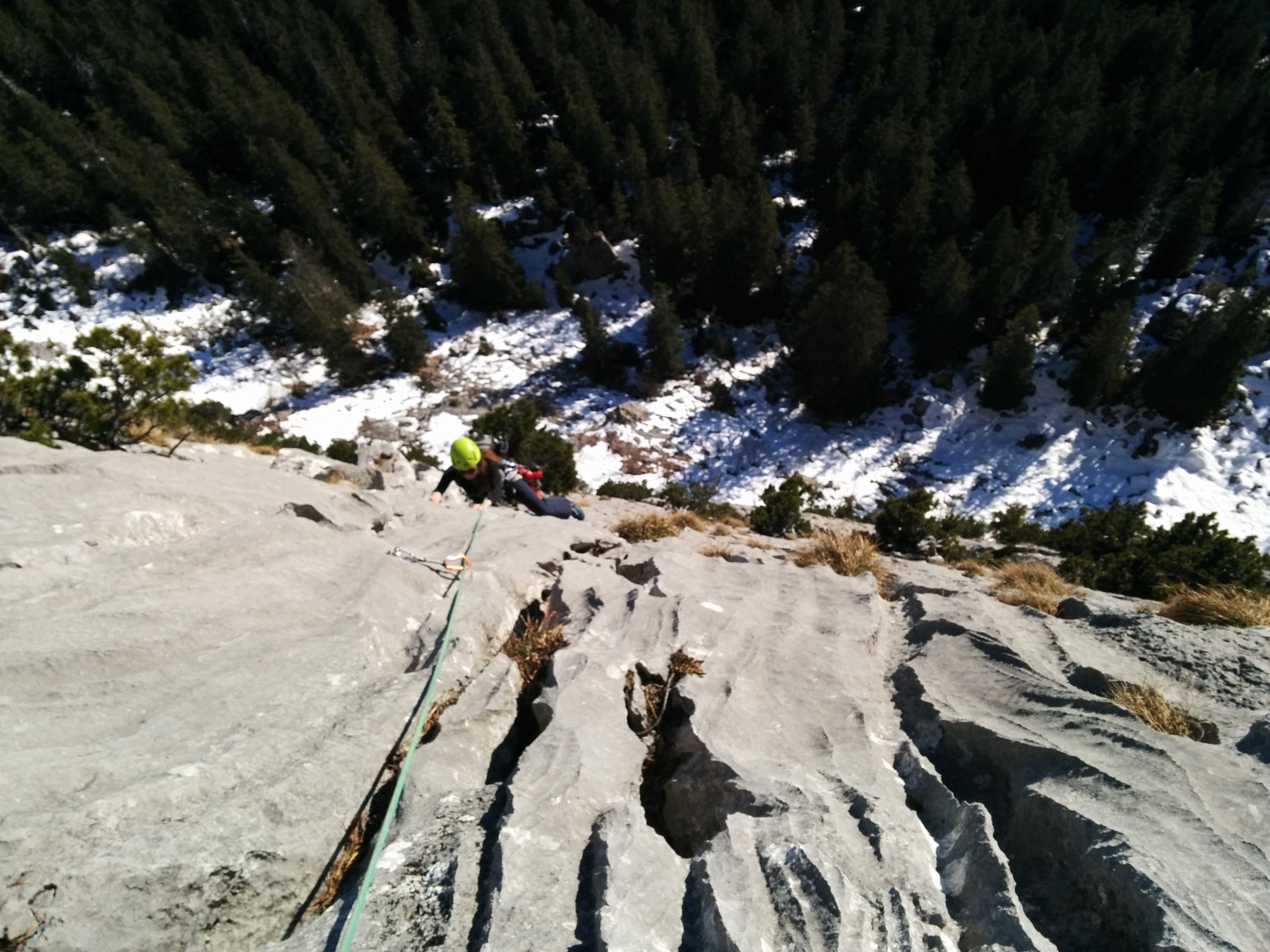 Perfekte Verhältnisse: Wand komplett trocken (außer ganz links, dort sah es stellenweise noch etwas feucht aus) und T-Shirt Wetter! Es waren sonst nur zwei andere Seilschaften unterwegs, es ist also ruhig am Brüggler... Fahrstrasse ist bis kurz unterhalb des Parkplatzes offen (5 CHF / Tag). Im Zustieg und oben auf dem Grat hat es noch ordentlich Schnee, festeres Schuhwerk empfehlenswert.