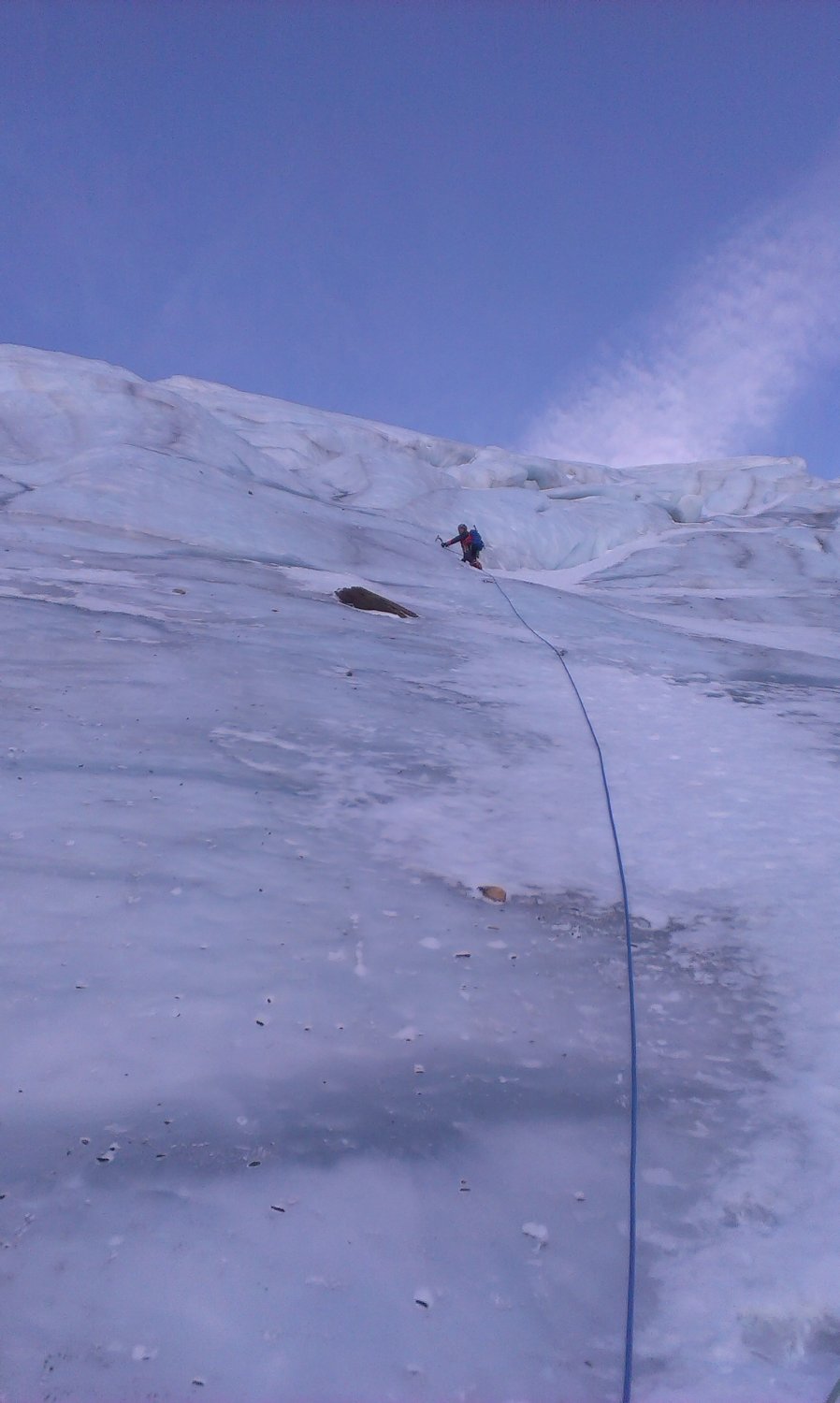 Insgesamt noch gute Verhältnisse. Der Neuschnee am Mittwoch und Donnerstag ist leider doch etwas üppiger ausgefallen als erwartet. Die Gletschliffplatten vor der ersten Serac Zone waren leicht gezuckert, jedoch objektiv sicherer zu klettern als die Firnvariante weiter rechts. Vom Trittfirn links neben den Seracs war nach dem Neuschnee nicht mehr viel übrig. Stattdessen musste man sich anstrengend nach oben wühlen. Der Eisbruch in 2/3 Wandhöhe muss zwingend in bis zu 80° sprödem Blankeis in 2 langen Seillängen erklettert werden. Danach guter Trittfirn. Am Gipfelhang hatte es dann leider wieder tiefen Pulverschnee. Abstieg über den Weißkarferner anstrengend durch tiefen Pulverschnee. Auch der Hochfeiler Normalweg war nicht ganz ohne, da sich unter dem lockeren Pulverschnee oft Eis gebildet hatte. Ein Abflug hier hätte sicher schlimme Folgen.