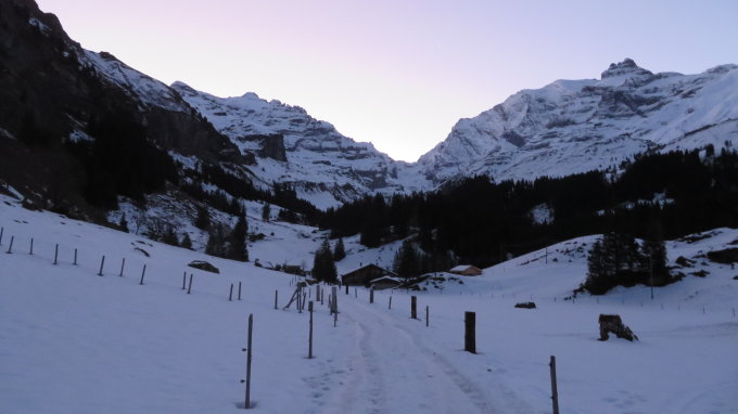 Momentan ab Griesalp noch knapp genügend Schnee auf der Fahrstrasse bis Bürgi P.1610m nur kurze tragstrecken 3x10m ohne Schnee.