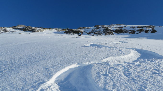 Oberhalb bis zum Gipfel meist noch schöne unverspurte Hänge mit Pulverschnee (siehe Bilder)