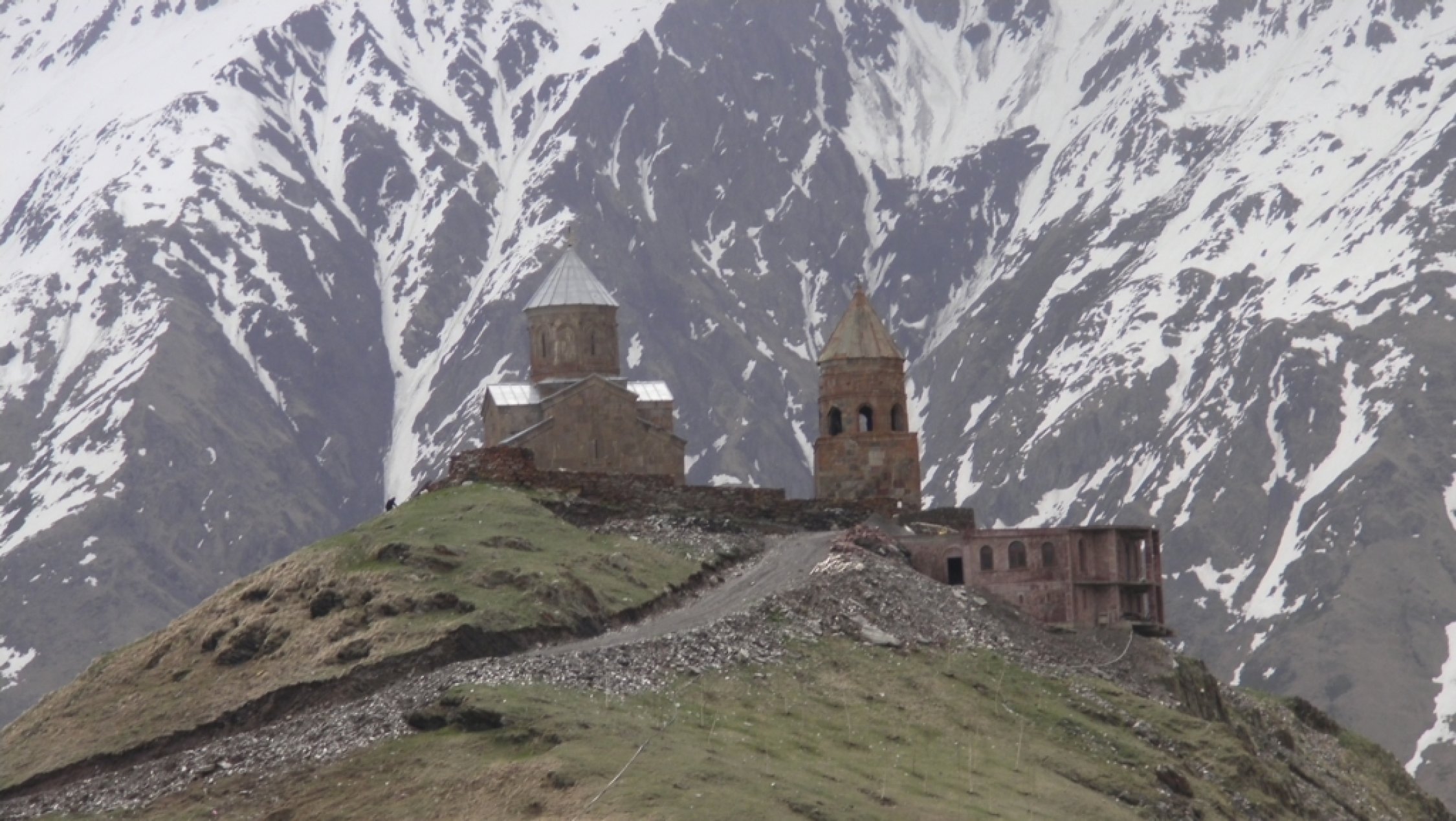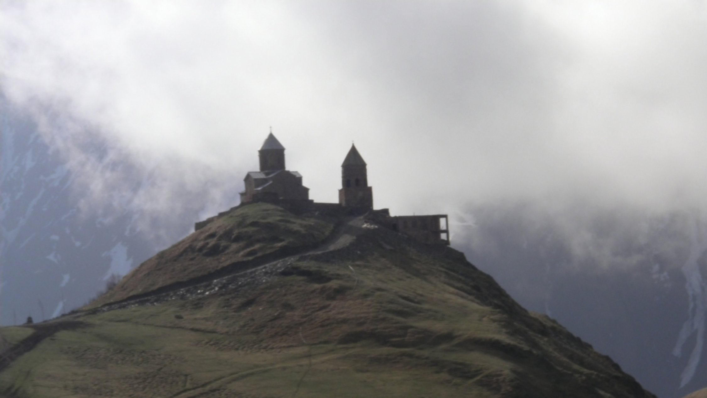 Nach einer Fahrt von Gudauri über den Kreuzpass erreichen wir nach einer abenteurlichen Fahrt die kleine Stadt Stephantsminda (das frühere Kazbegi). Wer den fabelhaften Blick mit Kasbek und der Kirche festhalten möchte, sollte am Hauptplatz halten und zwischen Hotel (grünes Haus) und der Statue Richtung Nord-Westen blicken, bei gutem Wetter rentiert sich dieser Stopp allemal.