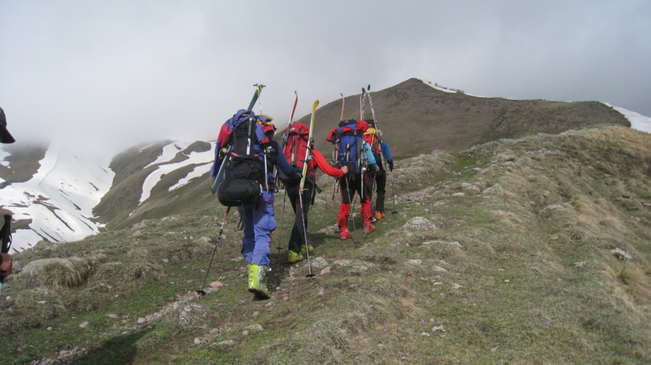 Wir erreichen schließlich mit unserem Allradfahrzeug das Plateau der Kirche Zminda Sameba und beginnen unsere Ausrüstung aus dem Fahrzeug zu räumen. Bei durchwachsenem Wetter machen wir uns abmarschbereit … ein letztes Gruppenfoto und los geht es. Mit den Skiern am Rucksack, vor 10 Tagen konnten die Aiblinger Bergsteiger sich hier bereits die Skier anschnallen, steigen wir in ca. 20 Minuten den Hang in nordwestlicher Richtung aufwärts Richtung Gratrücken und dann nach links hinausquerend zu einer Abflachung, hier ist ausreichend Schnee vorhanden, um die Skier unter die Füße zu nehmen. Neben dem Bach links reichen die Firnhänge noch mal ca. 150 HM weiter hinunter als hier im Aufstiegsweg, das werden wir uns in der Abfahrt wie letztes Jahr zu nutze machen. Wir ziehen mit unseren schweren Rucksäcken (Kocher, Essen, Schlafsack, Gletscherausrüstung usw.) weiter der Mulde links neben dem Bergrücken hinauf über eine letzte steilere Flanke bis zu einem Sattel auf ca. 2.950 m. Der Blick wird frei auf den wolkenverhangenen Kazbek und den weiteren Weg zur Hütte. Wir queren den Hang leicht abwärts und machen eine Pause in sicherem Abstand zu den Osthängen.
