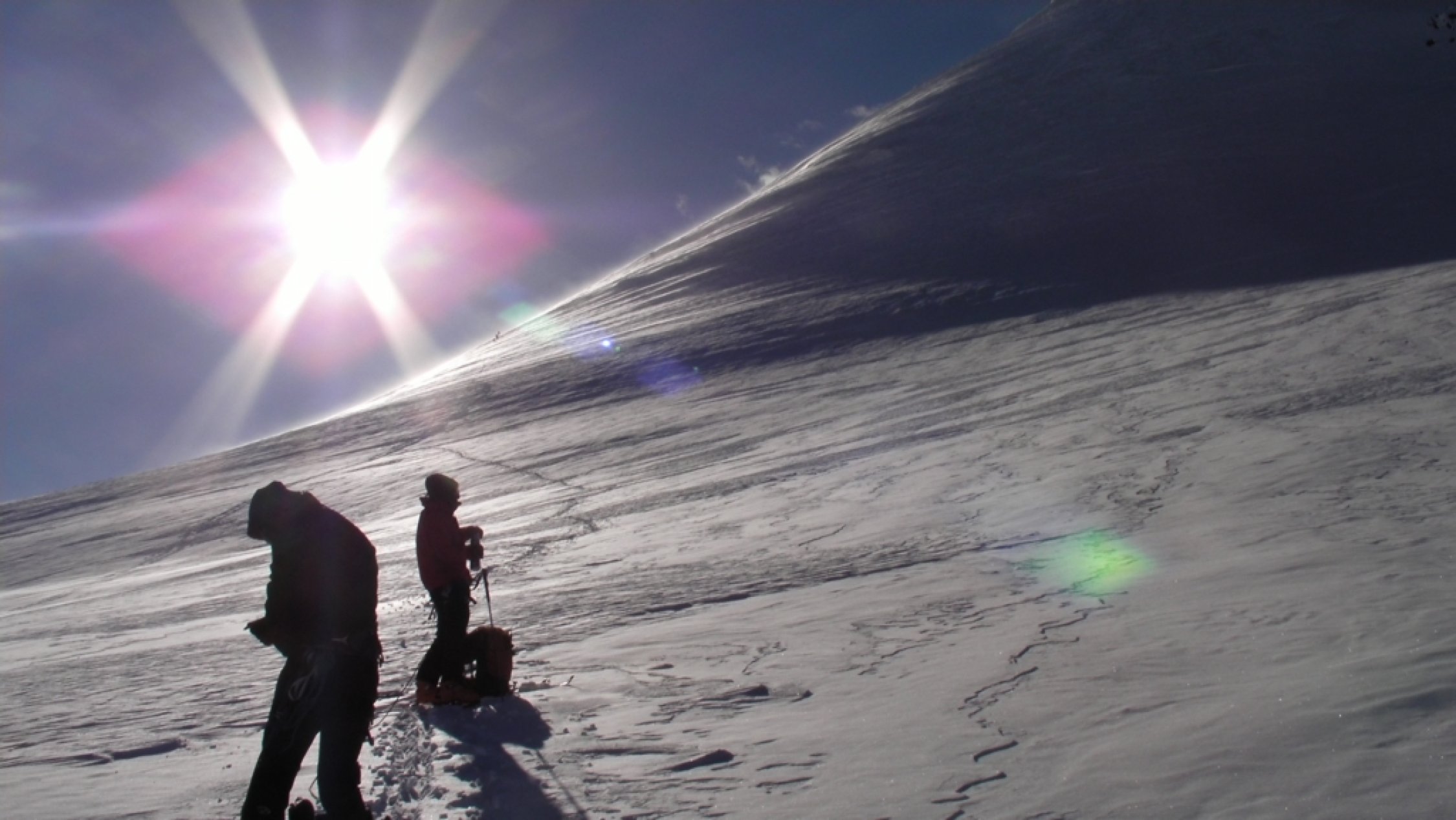 Nach der Metheo-Station geht es über den Gletscher ganz schnell rechts haltend in Richtung des gegenüberliegenden Felsvorsprunges. Wir verlassen den Gletscher auf ca. 3.500 m und genießen die ersten Hänge auf frischem, wenngleich nicht sehr lockerem, Pulverschnee. Bis hinunter auf ca. 3.100 m haben wir sehr guten Schnee und es macht super Spaß die Abfahrt … es lässt dich jetzt auch die Sonne blicken. Mit jedem Höhenmeter den wir näher an die Scharte kommen wird der Schnee weicher und weicher … die Hoffnung auf einen Firn wie im letzten Jahr können wir getrost begraben. Die Querung hinüber zur Scharte ist bei diesem Schnee nicht möglich 8nd so bleibt uns der kurze Gegenstieg nicht erspart. Am Sattel angekommen versucht der Karl wie vereinbart vergeblich unseren Fahrer zu erreichen.