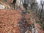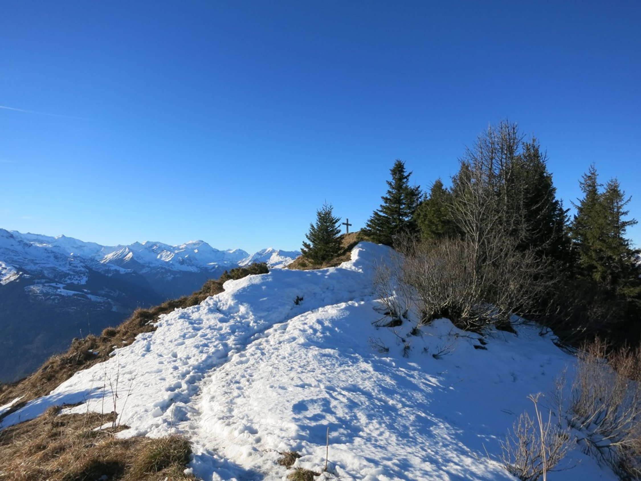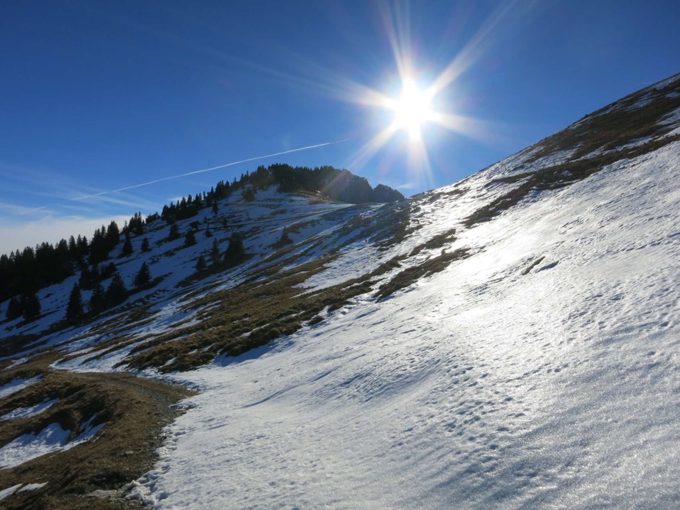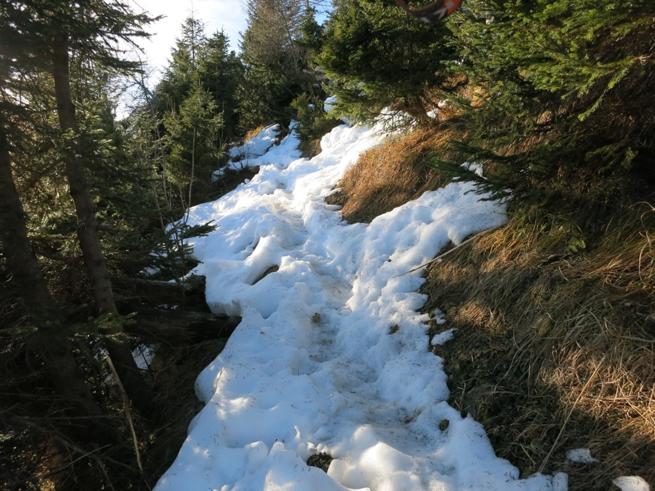Praktisch ganze Route trocken und gut zu begehen. Schnee erst oberhalb ca. 1‘550 Meter. Anfangs Trittschnee, aber gegen Schluss vor dem Gipfel ist der Schnee hart gefroren, hat aber eine gute Spur. Abstieg Richtung Folla mit Vorsicht zu begehen; auch hier ist der Schnee hart oder teils Blankeis.