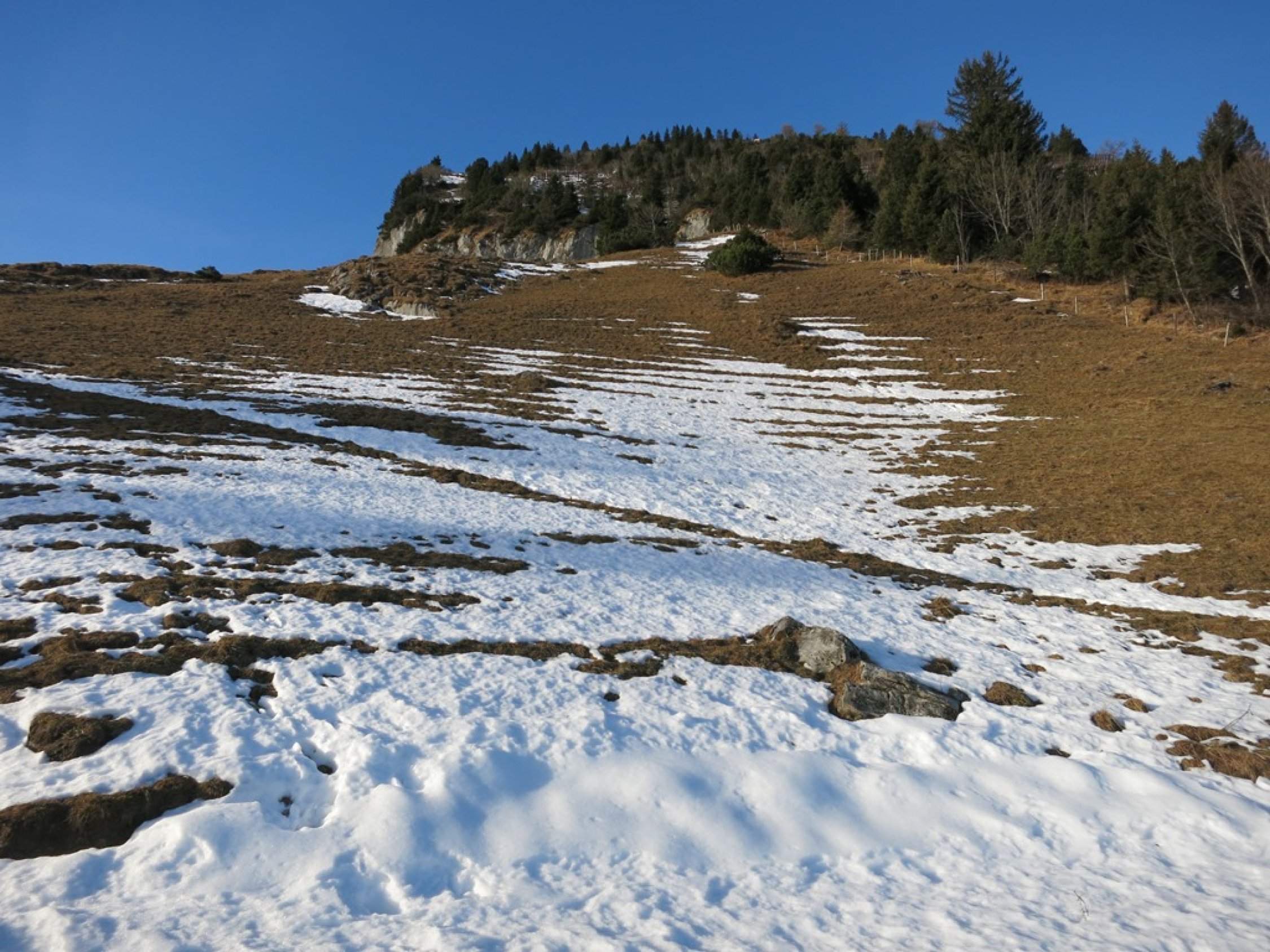 Aufstieg über den Osthang zum Weidhüttli und durch die Lawinenverbauungen ist eine schöne, aber steile Variante um auf den Gonzen zu gelangen. Dafür erspart man sich den grossen Bogen über den Berghaus Gonzen, den Rieterhütten und Folla.