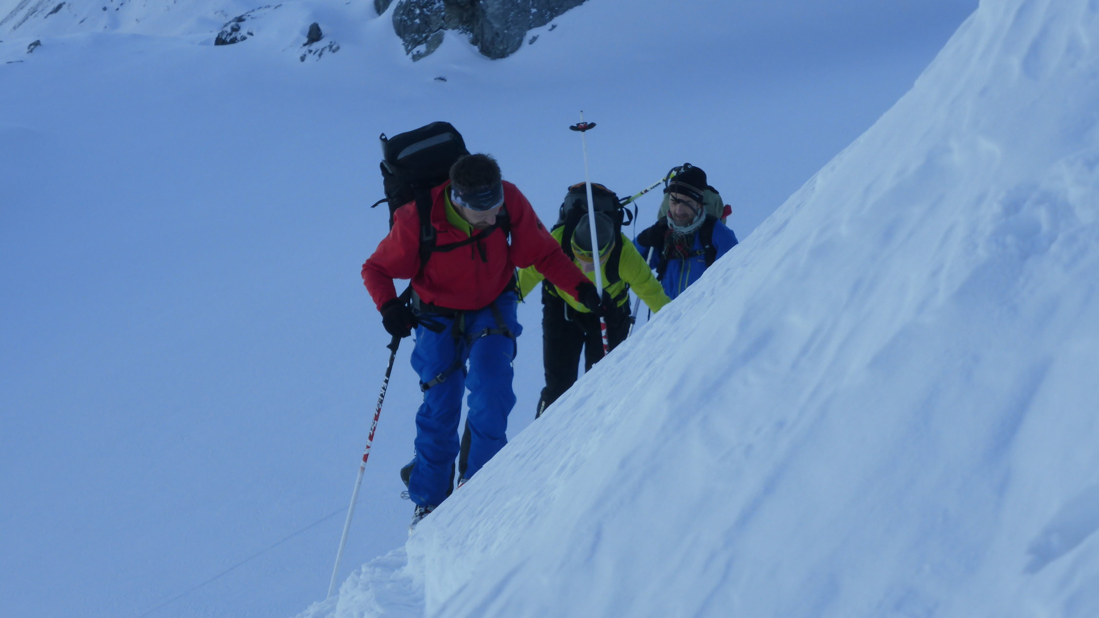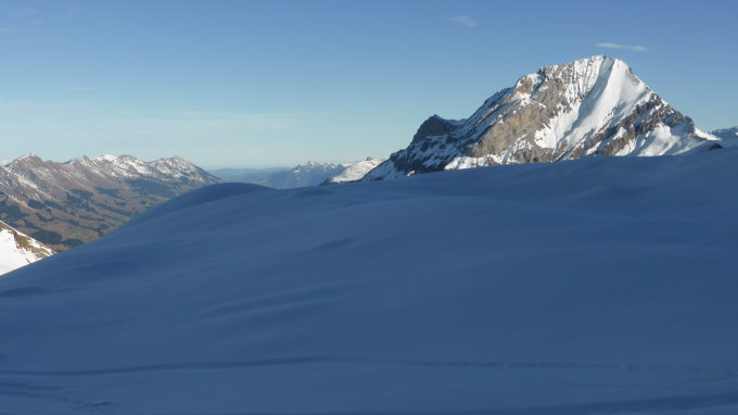 Unten vom Regen des Vortags glasig, ab ca. 2'200 Meter ganz wenig Pulver. Ganze Route besser als erwartet. Spur zur Traversierung zum Frühstückplatz viel zu tief angelegt und beim Ausstieg exterm steil und heikel (Herdentrieb, comme des mouton). Keine Wächte. Durch die Spaltenzone gut machbar, sind noch gut sichtbar. Abfahrt richtig gut. Blick gegen Norden zeigt wie weit hinauf kein Schnee liegt.