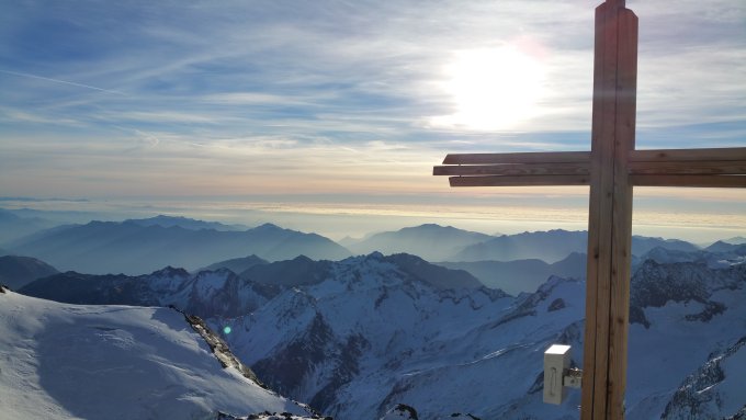 Das Fletschhorn hat im 2014 ein Gipfelkreuz erhalten. Die Box mit dem Gipfelbuch und einer Bergbiebel ist im November montiert worden. Danke an die Initianten und Helfer für das tolle Kreuz. Ich verbrachte knapp 1,5 Stunden bei schönstem Sonnenschein auf dem Gipfel. Unglaublich für einen 22. Dezember.