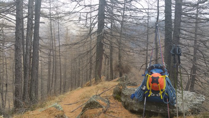 Allgemein wenig Schnee und sehr inhomogen aufgebaut, auch in der Wand. Die verschiedenen Schichten sind jedoch meist gut verbunden. Am Montag von Simplon-Dorf Eggen gestartet, man könnte jedoch noch bis Rossbodenstafel hochfahren (4x4 von Vorteil). Die Ski bis auf 2100 getragen und von 2300 bis 2500 nochmals geschultert. Das Biwak war ziemlich kalt mit -1°C.