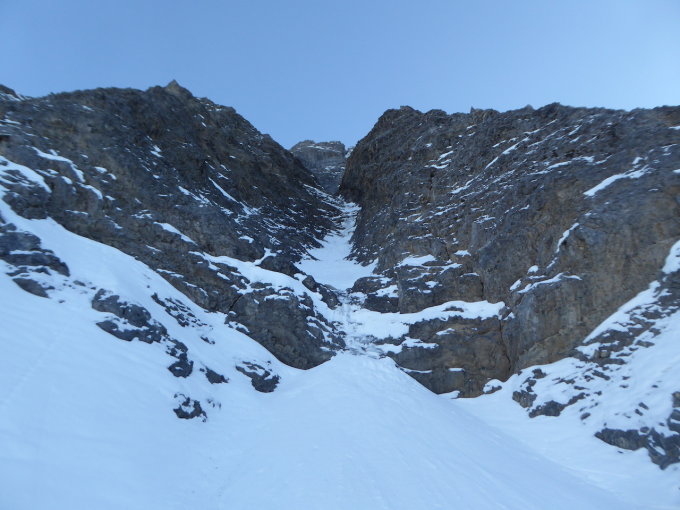 Einstiegscouloir sehr wenig Eis. Wir sind im Schnee-Mixedkessel rechts davon hoch gestiegen (kaum sicherbare Felspassagen zwischen Schneegewühle) und nach 70 m links hinüber unter den 1. Aufschwung der Stapfetenstrasse gequert (problemlos).
