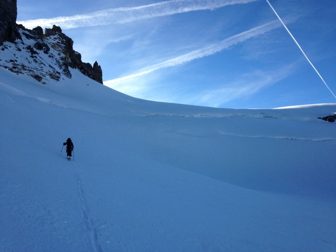 Schnee an Passstrasse vorhanden, wenn auch knapp. Erster Aufschwung im Slalom zwischen Büschen, Grasflecken und auch Schnee. Sehr mühsam zu gehen, da zerfahren, morgens eisig und rutschig. Gletscher hoch ok, Fussaufstieg ebenfalls.