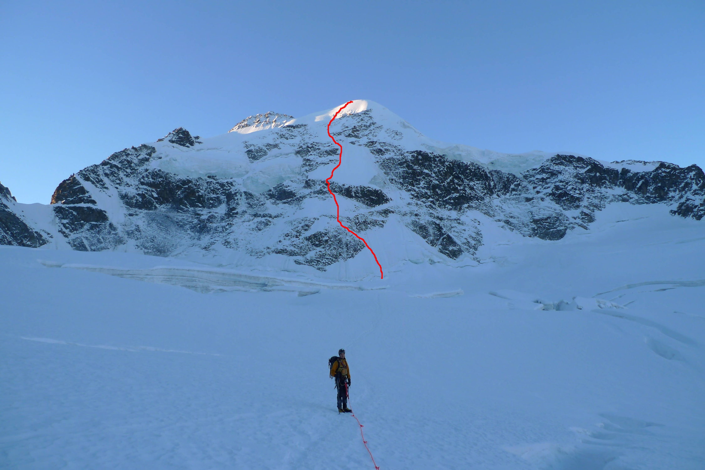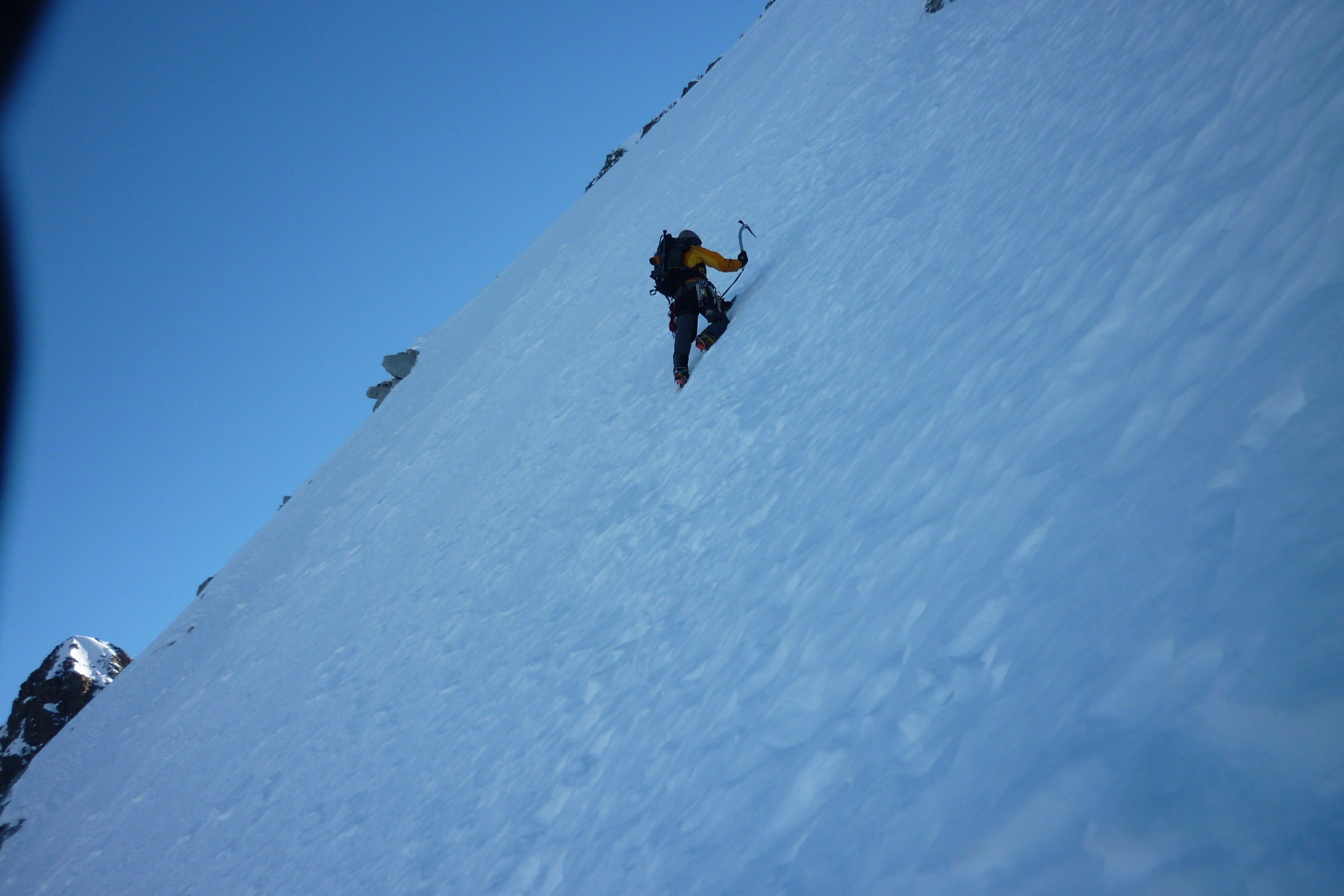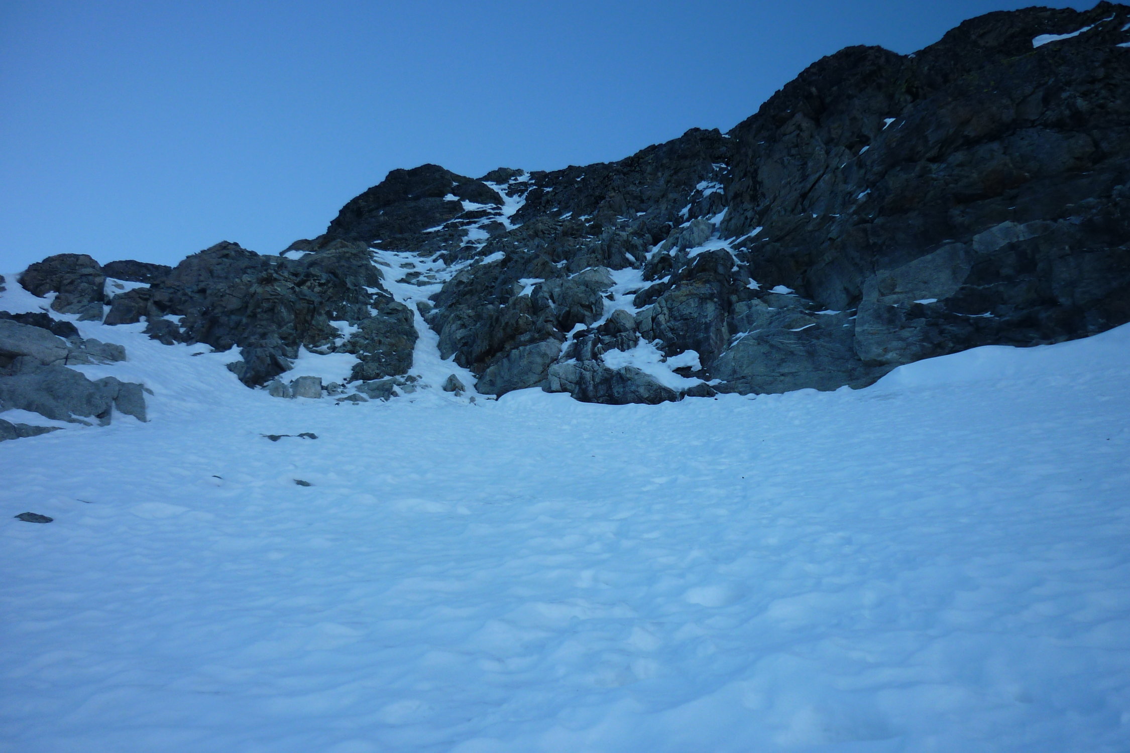 Wand ist derzeitig in sehr guten Bedingungen, Wechsel zwischen besten Trittschnee und Styroporschnee selten und nur kurze eisige Passagen. Wir haben wie auch anscheinend die vorherige Seilschaft den Felsriegel im oberen mittleren Rand des unteren Schneefeldes durch 2 schöne Gullies (65°)durchstiegen und auch nur diesen gesichert.