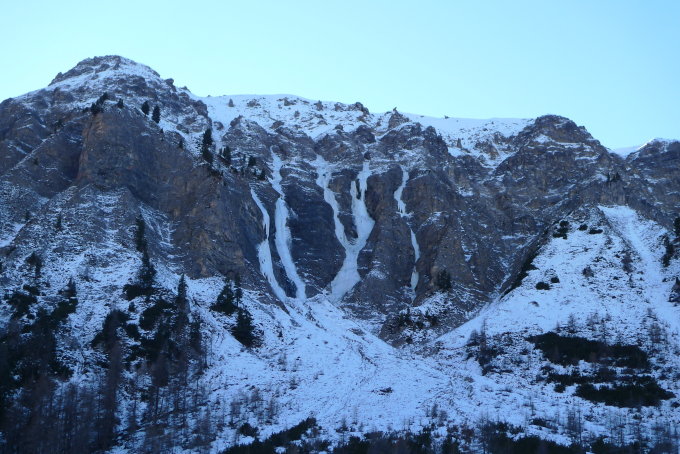Derzeit ganz gute Eisverhältnisse in Sertig. Haben das ganz rechte Couloir und den zweiten Eisfall von rechts mit der kleinen Säule als Ausstiegsvariante geklettert. Die Fälle sind derzeit aufgrund ihres geringmächtigen Aufbaus wohl noch etwas schwerer als in den Führern angegeben.So gut wie kein Schnee beim Zustieg.