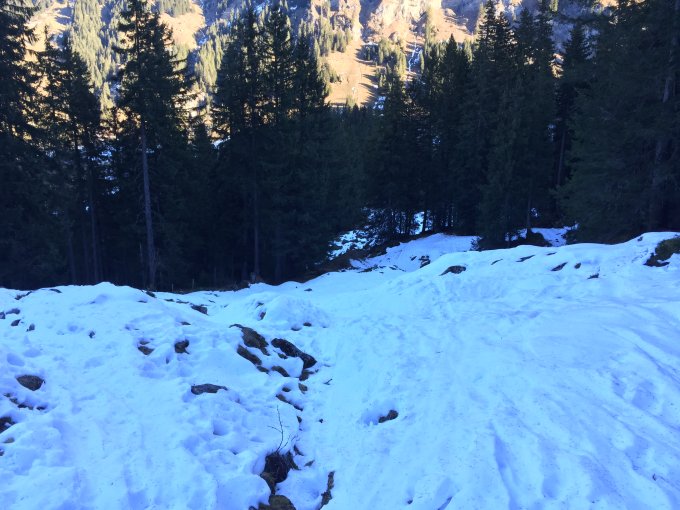 Die schlechte Nachricht Nr. 1: Im Wald auf der Strasse Richtung Bundalp hat es zu wenig (kurze Tragestrecken) und das, was es hat, ist verkarrt und vereist.