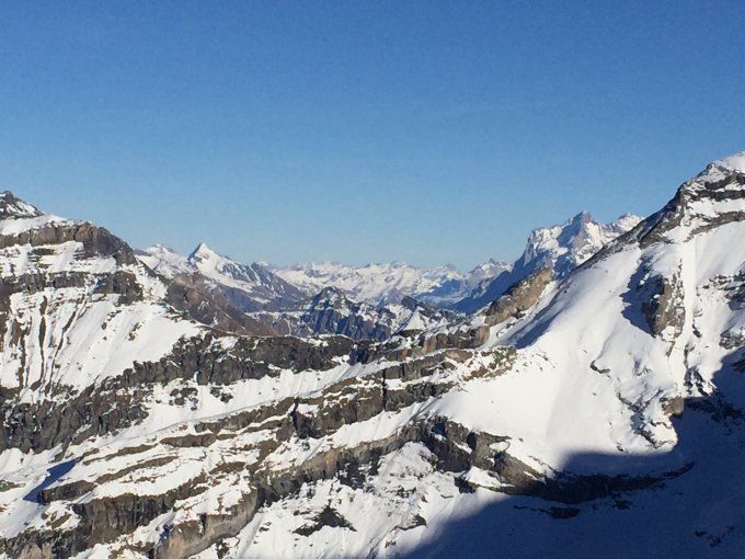 Die gute Nachricht Nr. 3: ...der Übergang zu altem, etwas verblasenem, aber immerhin Pulver! Muss sehr alter Pulver sein :-). Weiterer Aufstieg in guter, teils überwehter Spur problemlos bis zum Gipfel. Dort schöne Rast in einer phantastischen Landschaft, wobei die Sonnenbrille die ganze Zeit über im Rucksack blieb, der Hang ist wirklich ein Schattenloch, erst oben gibt es etwas Sonne. Damit kommen wir zur: