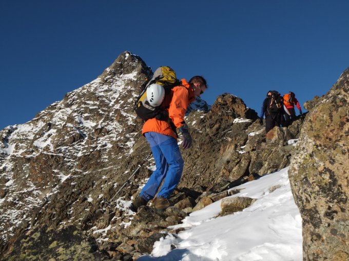 Insgesamt sehr gute Verhältnisse für dieses winterliche Datum. Bis zur Fuorcla Albana (mit erneuerter Schutzhütte) weitgehend schneefrei. Darüber ist die Aufstiegspur nur mit wenig Schnee belegt. Die steilen und ausgesetzten Stellen sind mit Ketten versichert.
