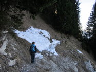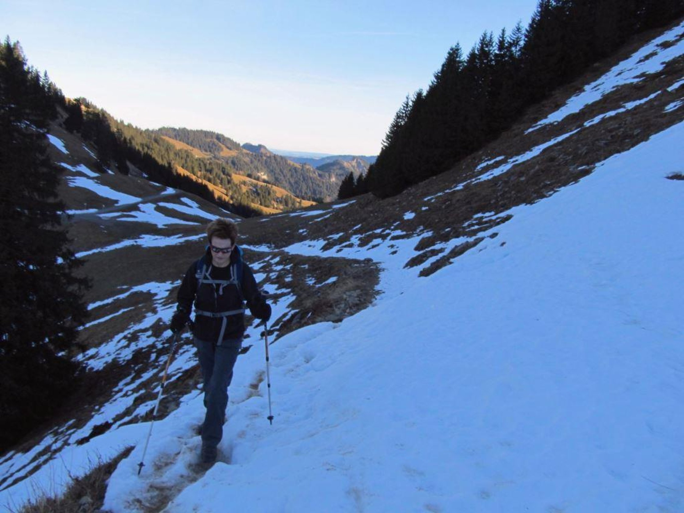 Im Aufstieg vom Treietpass zur Hohen Kugel lag im freien Gelände oberhalb der Waldpassage hartgefrorener Schnee, ebenso beim Abstieg in der Waldschneise an der Südwestrippe. Stöcke waren hier hilfreich.
