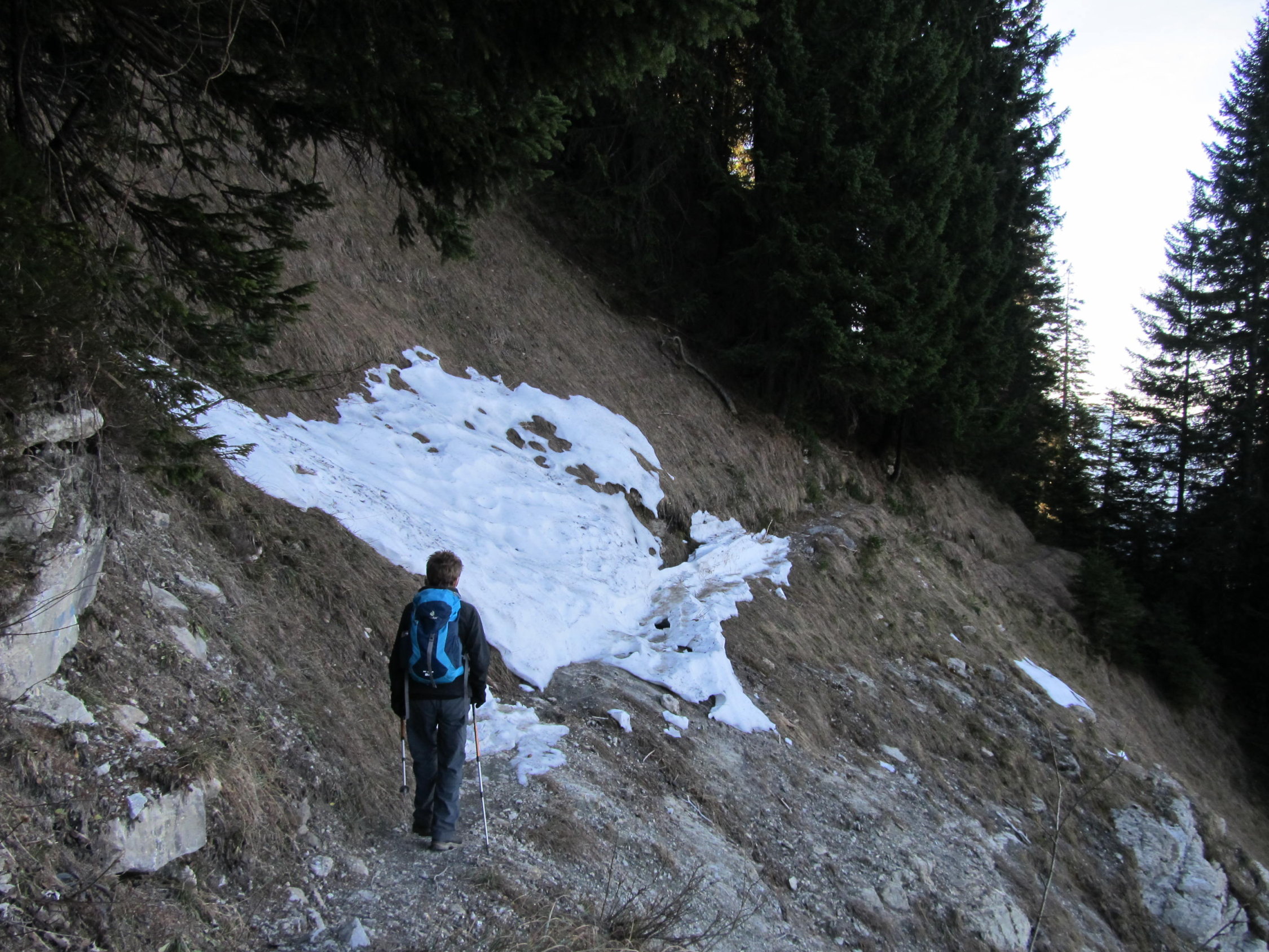 Vom Start weg mild, die Wege waren bis über das Fraxner Maiensäß hinauf praktisch trocken, zum Teil war der Boden aber gefroren. In der Querung der abschüssigen Flanke im Rotersteinerriesweg lag an zwei Stellen hartgefrorener Schnee mit Tritten.
