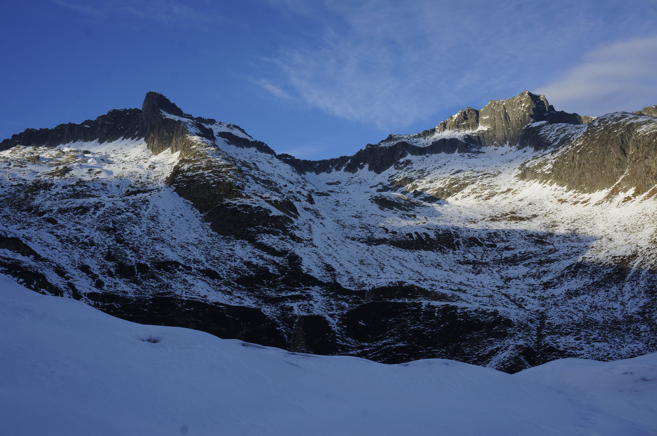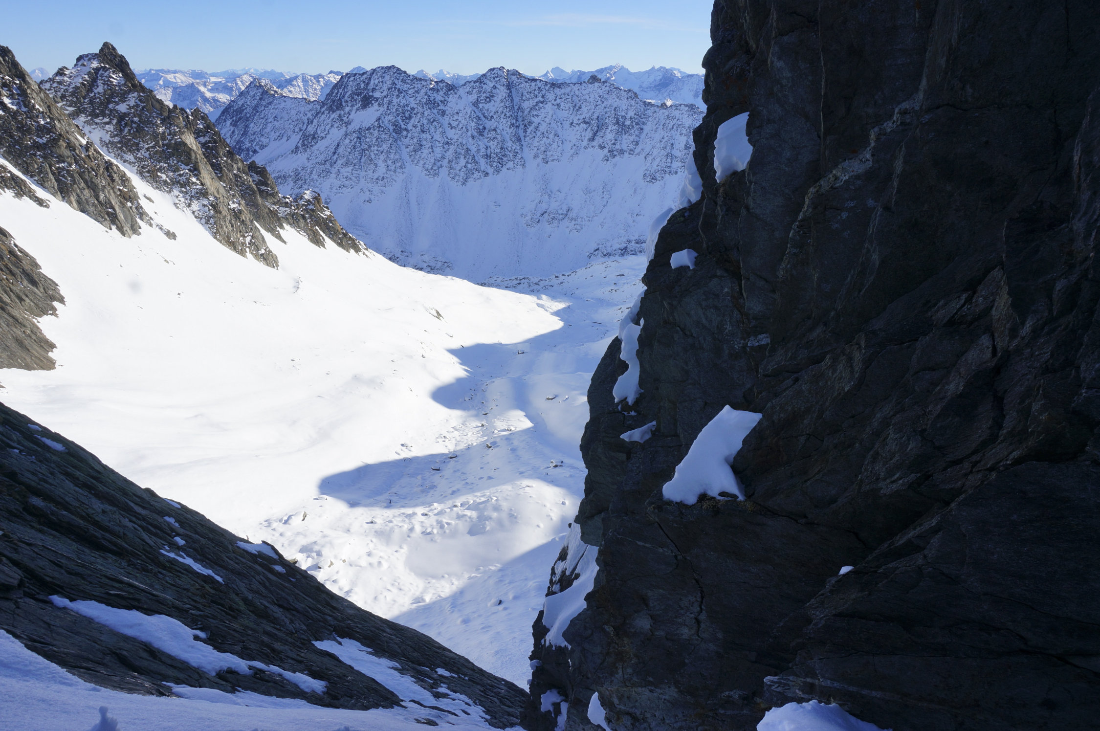 Der Plan war, die Düssis zu überschreiten und zur Hüfi-Hütte zu gelangen. Nachdem ich zu spät aufgebrochen und dann auch noch zu langsam war (erst zu hoch an der Gratschulter, dann Mühe in der eisigen Rinne) ging die Sonne unter, bevor ich die Gipfelzone erreichte.