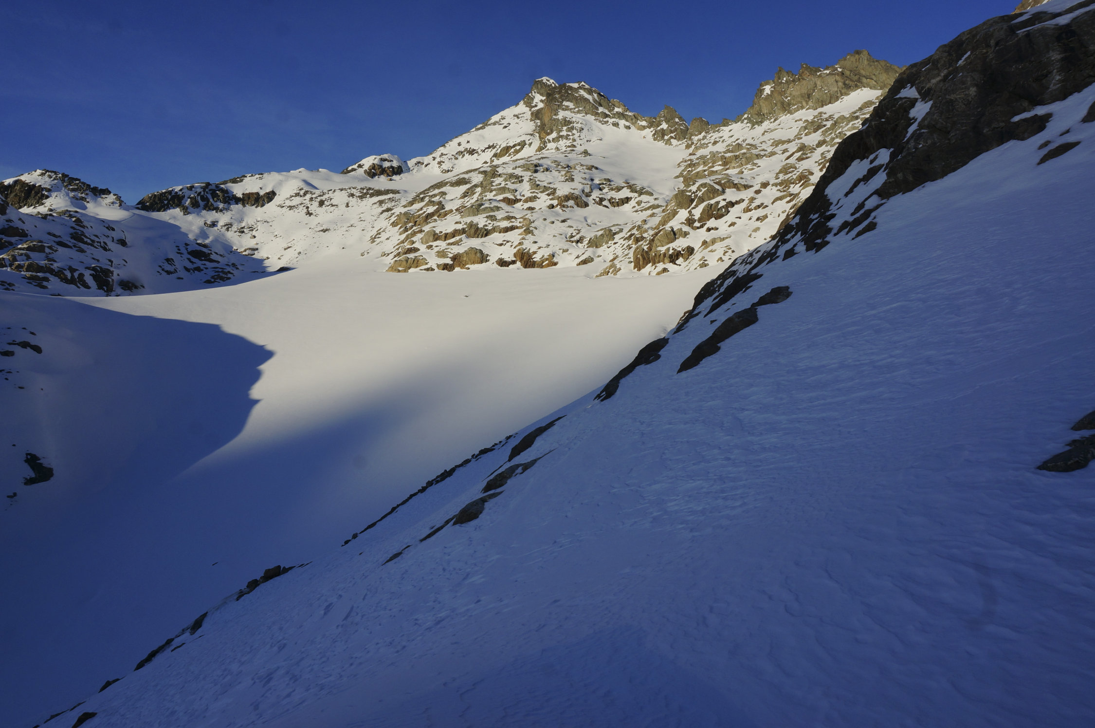 Im hellen Mondschein entschloss ich mich, ins Maderaner Tal abzusteigen, in der Hoffnung, in Hinterbalm einen Biwakraum zu finden. Hier ist keine Ski- oder Wanderroute verzeichnet, und das Gelände ist unübersichtlich. Abfahrt nach Süden bis oberhalb des Tschingelsees, dann nach Westen, hier hab ich den Punkt 2198 aber verpasst, und geriet in die Steilrinne knapp nördlich davon. In dieser konnte ich den Talboden mit etwas Mühe erreichen, mehrere kurze steile Eipasssagen wurde mittels Abseilen an einer 10m-Reepschnur bewältigt. Die (private) Hütte in Hinterbalm fand ich verschlossen vor, auch kein Winter- oder Biwakraum, sämtliche Häuser und Hütten des kleinen Weilers fest verriegelt. Immerhin Frischwasser aus einer Druckleitung. Schliesslich bin ich auf dem Sommerweg durch das Brunnibachtal weiter abgestiegen endlich im beginnenden Tageslicht bis zur BusStation in Bristen gelangt. Im Maderandertal wenige kurze mit Ski befahrbare Abschnitte (zwischen Guferen und Stössi), den Rest zu Fuss auf dem überwiegend aperen Fahrweg.