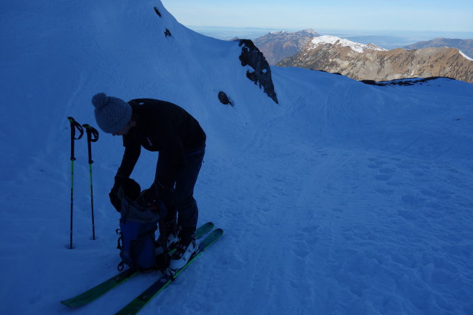 Start kurz vor 9 an der Bergstation. Schnee bretthart gefroren. Das Gehen in der Aufstiegsspur ist eher mühsam, da sehr eisig. Neben der Spur recht gut zu gehen. Harscheisen blieben im Rucksack, könnten aber durchaus verwendet werden. Nach 1h 50min am Gipfel. Im Anbetracht der Schneelage trotzdem ganz nette Tour in einer schönen Umgebung. In der Abfahrt immer noch harte / eisige Verhältnisse. Kein Powdervergnügen, aber trotzdem gut fahrbar. Machte durchaus Spaß, auch bei wenig Schnee. Steinkontakt kann ohne Probleme vermieden werden, da Schnee durchweg hart und Steine gut sichtbar sind. Auf die Talabfahrt wurde verzichtet.