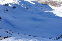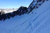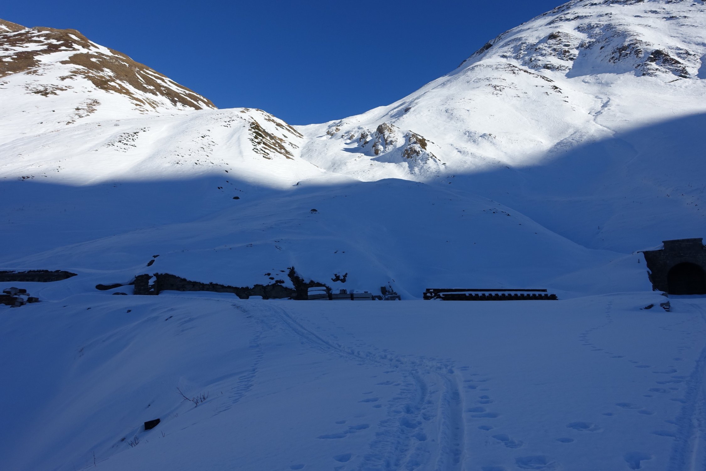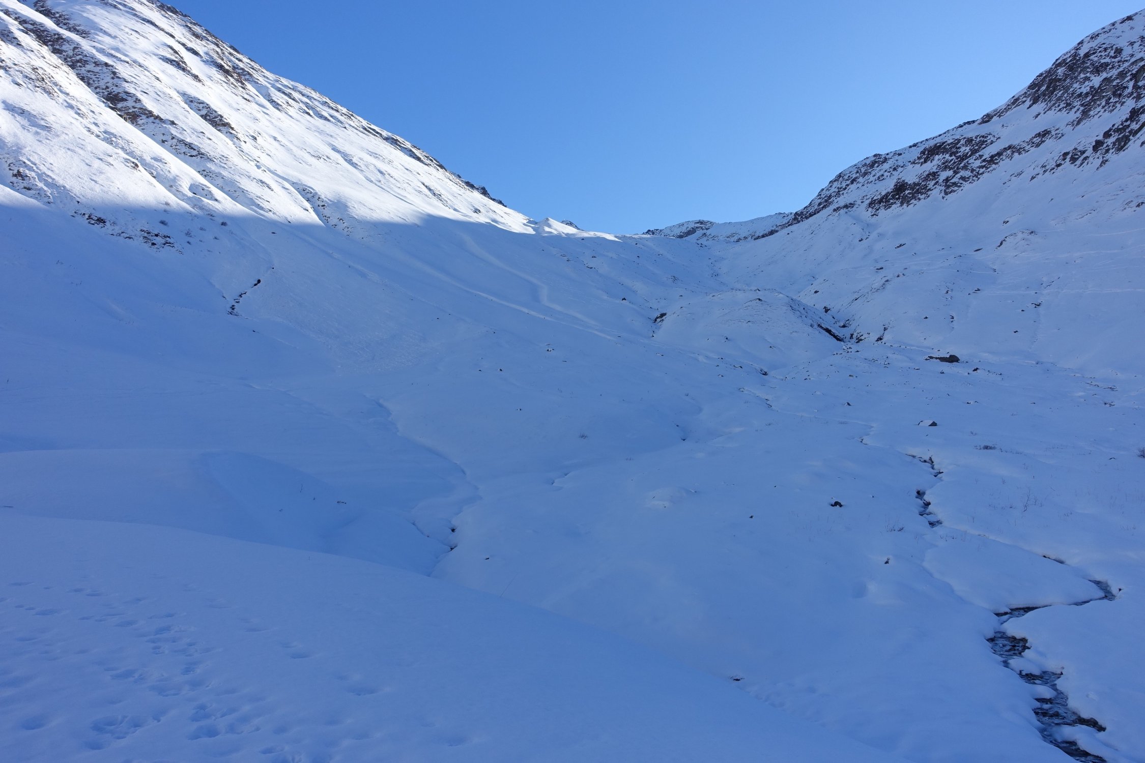 Es herrschen ganz einfach feudale Verhältnisse (man ist ja derzeit nicht gerade verwöhnt...) und mit etwas defensiver Fahrweise kann immer noch im schönen Pulver und ohne Steinkontakt bis zum Tunnelportal abgefahren werden. Man halte sich möglichst links, auf der Tällistockseite. Nach einigen Traversen sind dort immer wieder schöne, pulverige Hänge zu finden! Der Gegenanstieg von gut 300 Hm auf die Passhöhe nimmt man da gerne in Angriff. Es hat noch viel Platz für eigene Spuren!