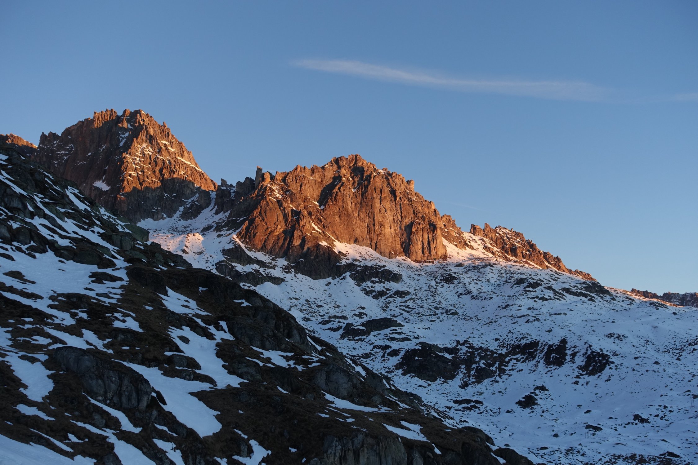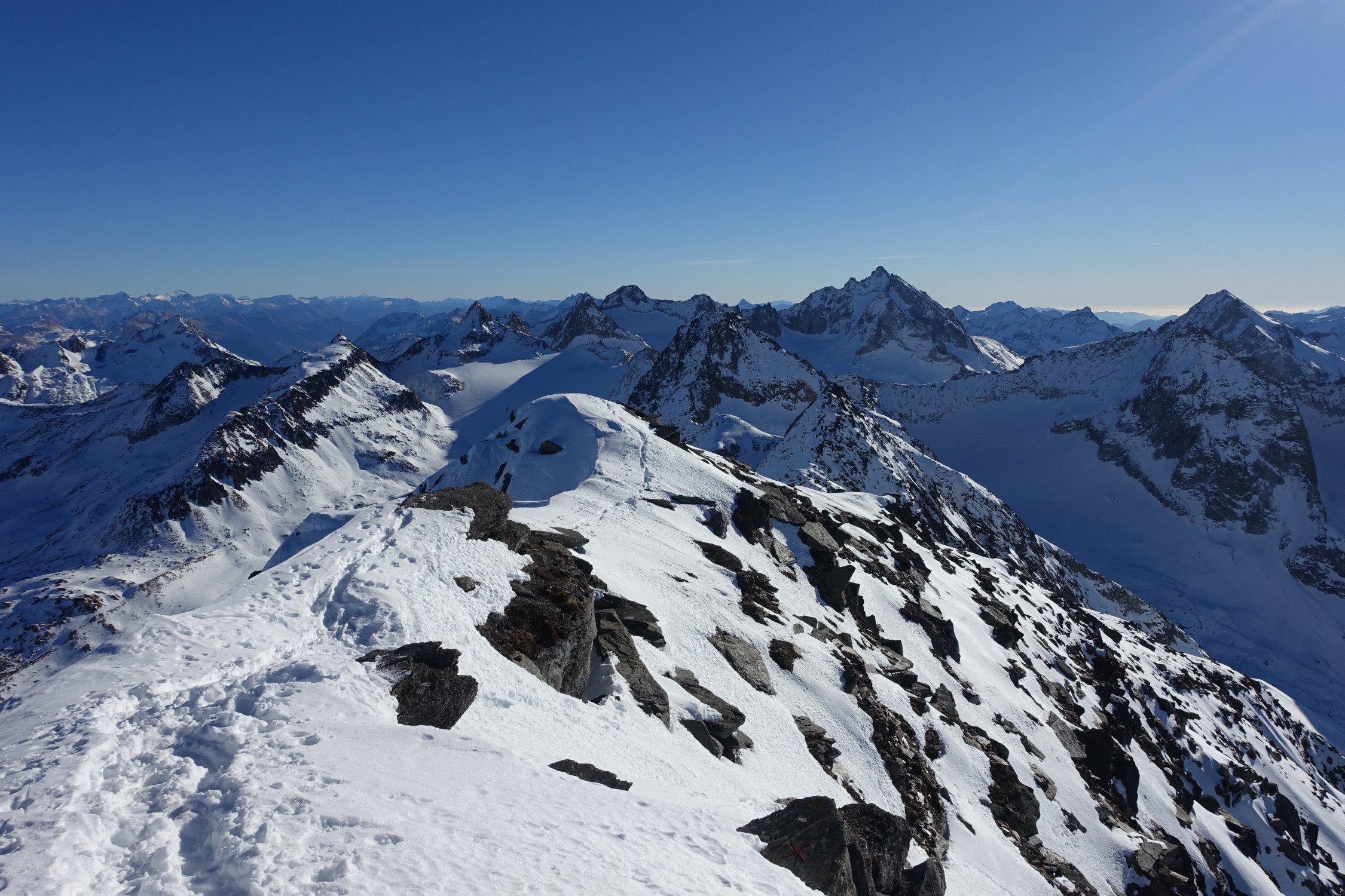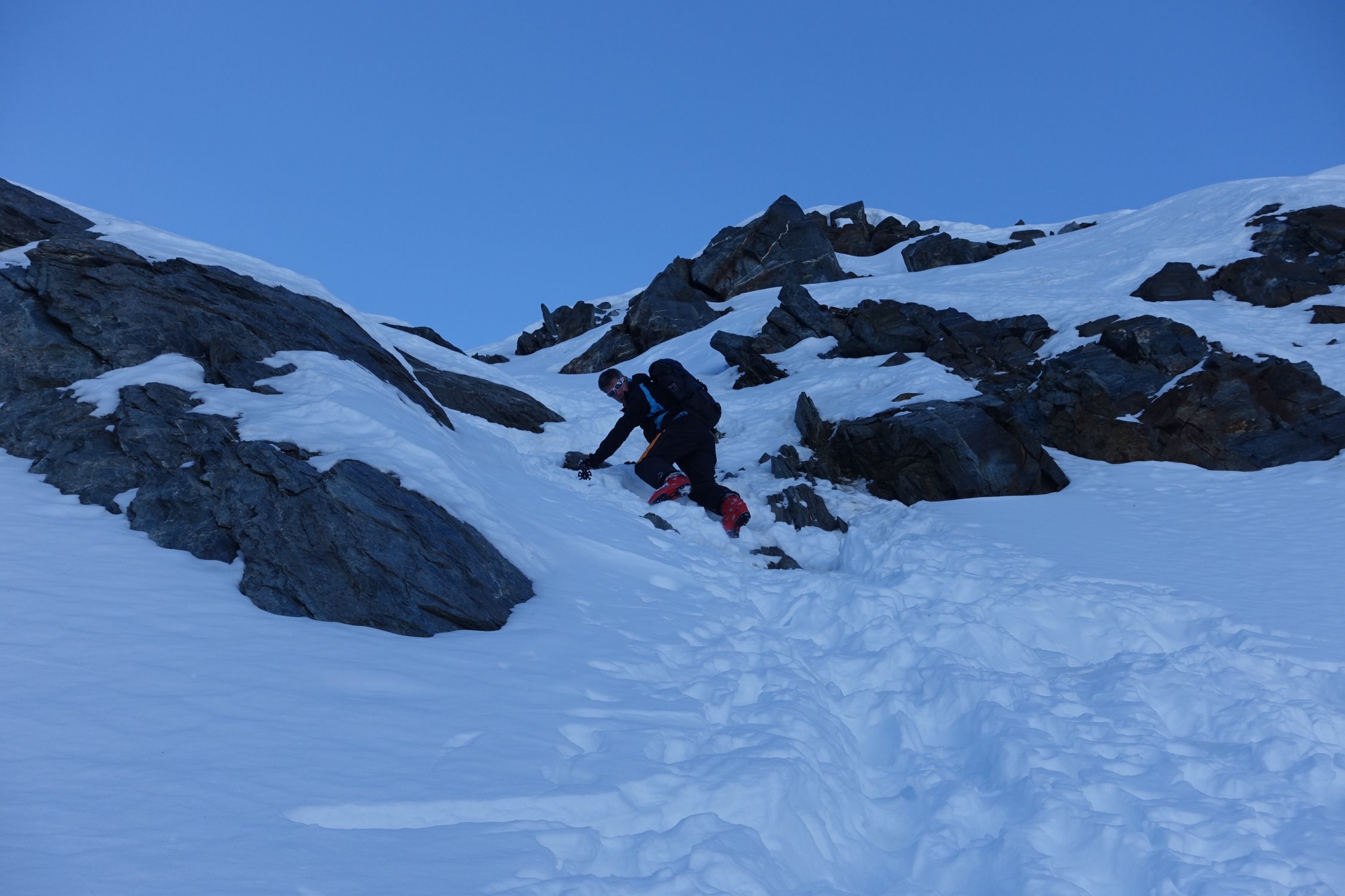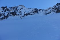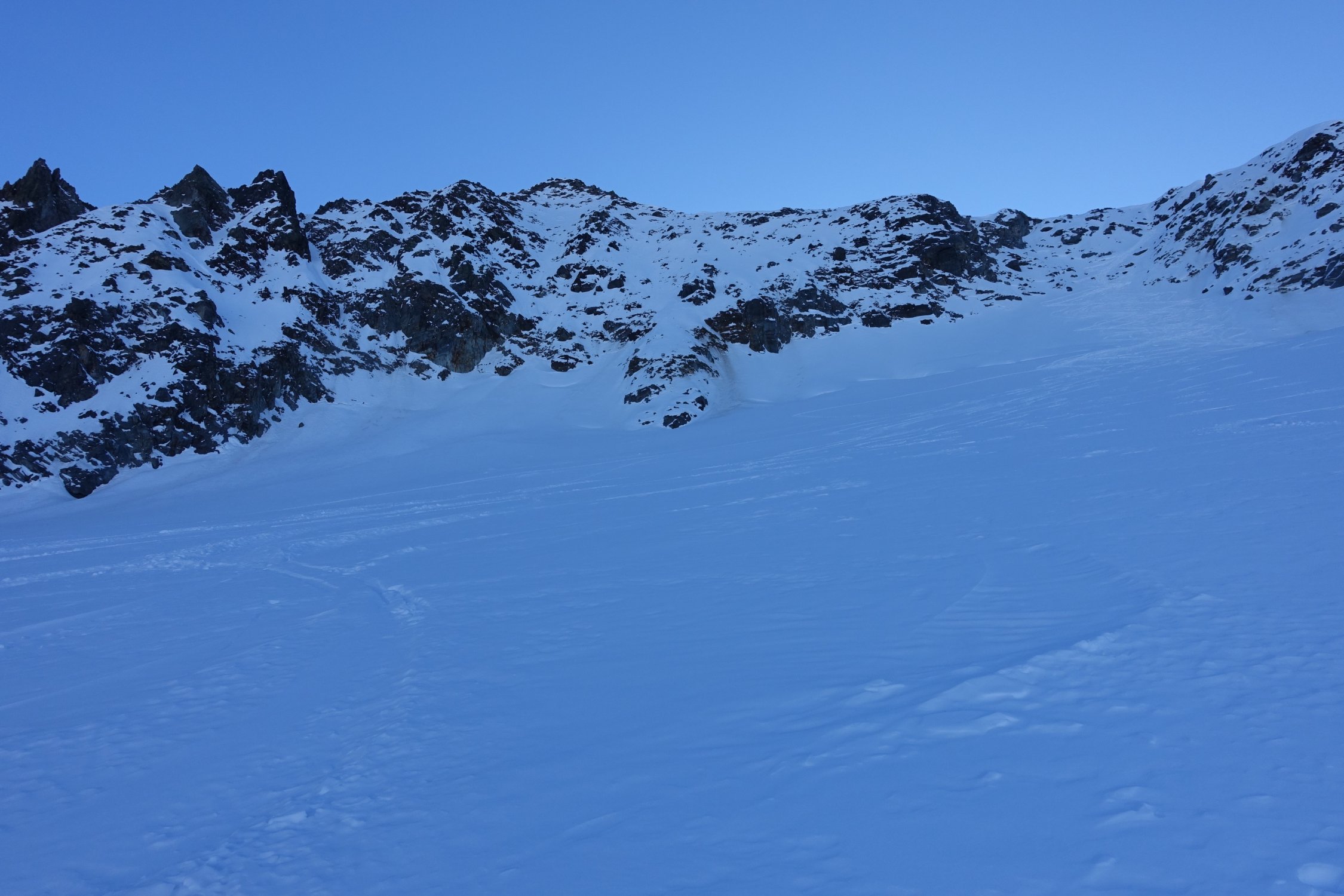 Der Bergschrund unter dem Westgrat des Gross Muttenhorn kann problemlos überschritten, bzw. überfahren werden. Die offenen Zonen sind gut sichtbar. Guter Trittschnee bis auf den Gipfel. Steigeisen derzeit nicht erforderlich.