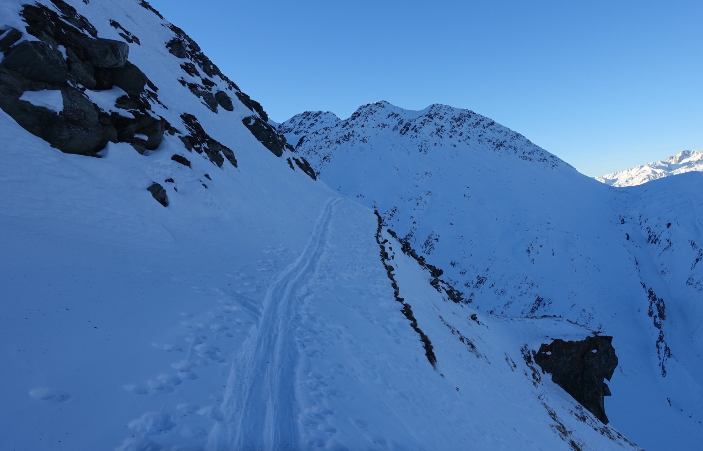 Blauberg-Westflanke hat eine recht gute Spur und kann derzeit auch ohne Harsteisen begangen werden.