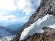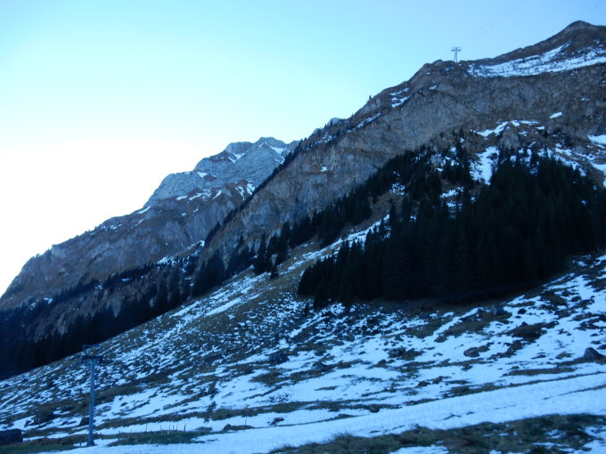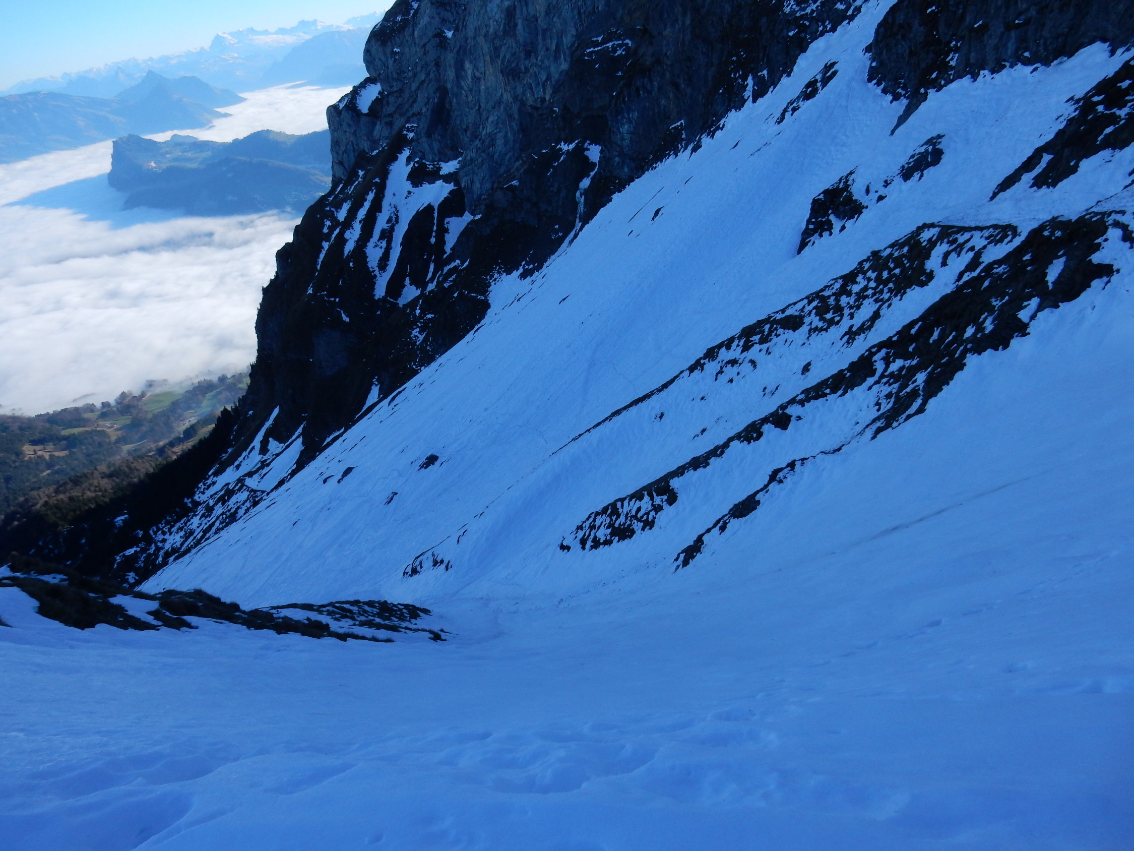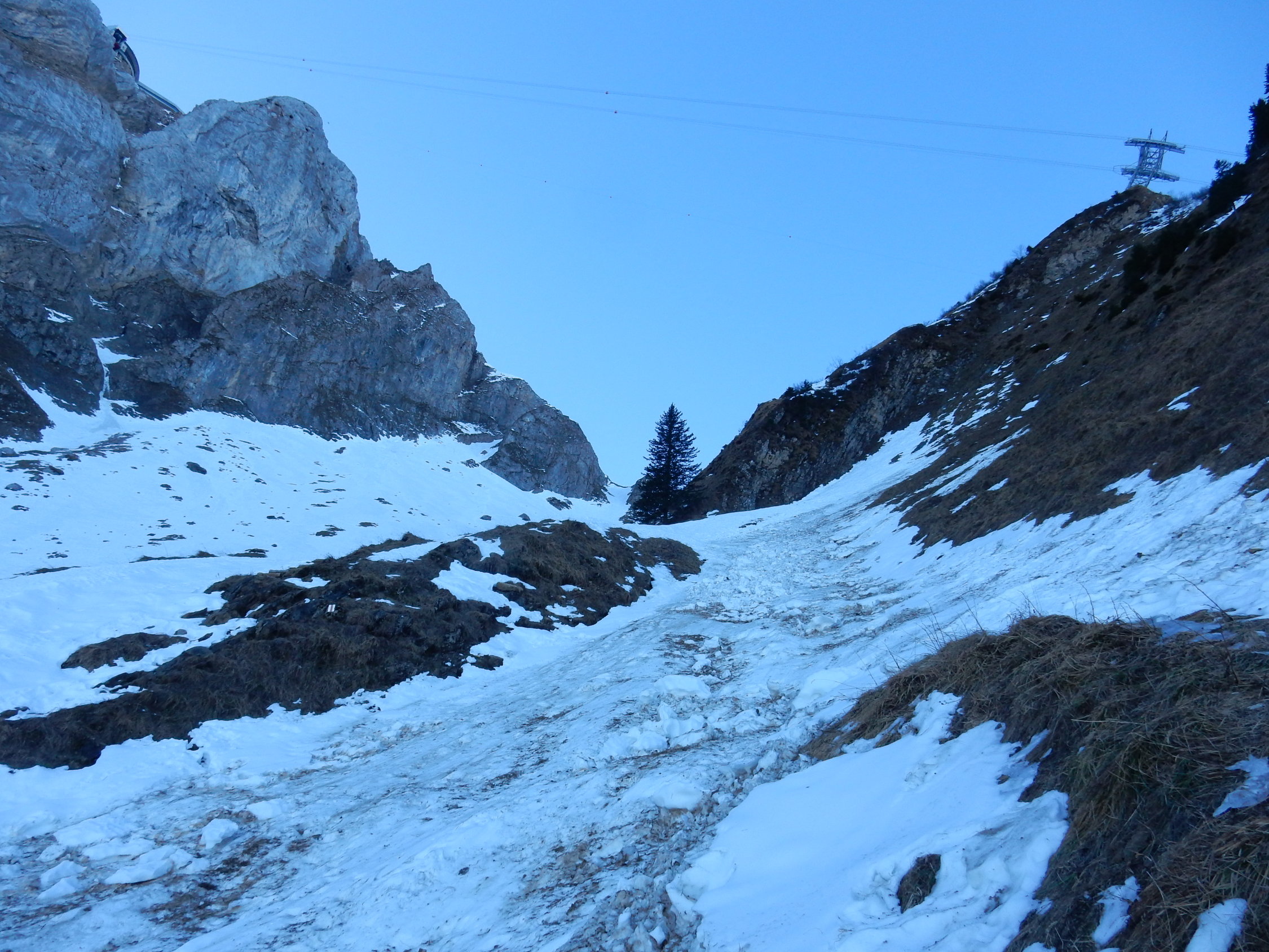 Gsässweg grösstenteils Schneefrei, ab Zusammenzug Nauenweg geschlossene harte Schneedecke bis hinauf zur Klimsenkapelle. Mit Steigeisen und Pickel gut begehbar, ohne würde ich momentan nicht einsteigen! Ab Klimsenkapelle starker Wind, immer ohne gross Höhenmeter vernichtend zuerst im Gras dann wieder in geschlossener Schneedecke hinüber gequert zum Chastelendossen. Dann über alten Tomliweg (alles im guten, harten Firn) hinauf zum Tomlishorn. Südseitig schneefrei. Weg zum Pilatuskulm nicht ganz ohne, einige Stellen mussten unten durch gequert werden, der eigentliche Höhepunkt der Schwierigkeiten!