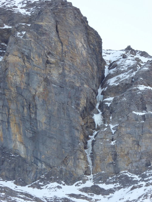Einstiegsseillänge nur knappe Säule aber recht gut kletterbar. Absicherung mit Friends im Fels gut möglich. Die anschleissenden Meter weisen recht viel Eis auf und können ausreichend gesichert werden. Die 3. Sl. mit dem Vorhang ist heikel, durchgerissen und nur stellenweise am Fels angefroren...wir haben die 10 steilsten Meter rechts Mixed umgangen (M4-5, mittlere Friends). Im Ausstieg Griesschneewühlerei und Mikedklettern im gefrorenen Sand und Bruchfels. Gipfelgrat fast wie im Sommer im brüchigen Fels/Schutt. Abstieg durch abseilen 7x50m über die Route. Oben zwei Normalhakenstände gebaut. Eine wirklich schöne aber abgelegene Tour!