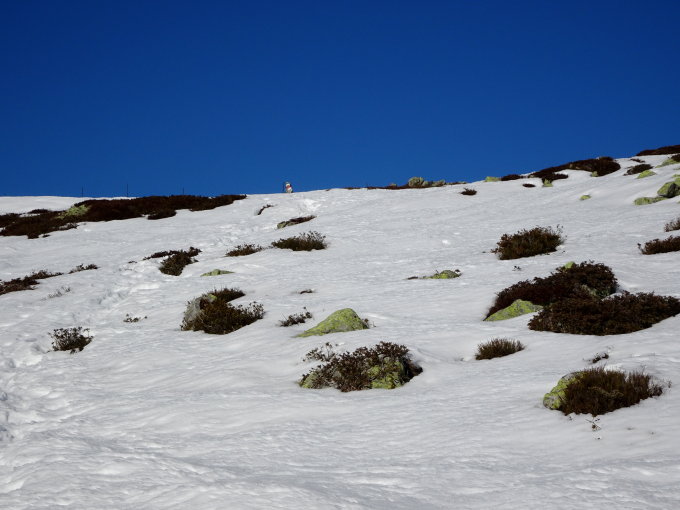 Die Leuten des Wildschutzes werden bestimmt enttäusch sein, wenn sie die Fotofalle, die ich aktiviert habe, auswerten werden. Anstelle des erhofften Luchs wandert ein Bergsteiger die Strasse zum Grünenbergpass hinauf. Excüsi, aber ich musste dort durch und habe die Falle gemerkt nur eine Sekunde bevor sie losging. Sie werden sich sagen: Ein Wanderer ist immerhin besser als Nichts!