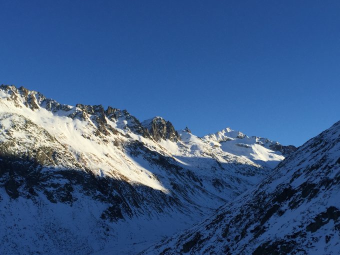 Bei absolutem Traumwetter mit wunderbar klarer Sicht und bei weniger wunderbaren, aber doch ganz akzeptablen Schneeverhältnissen in Realp gestartet, man kann unverändert bei der Dampfbahn die Ski anziehen und hat nur 2 ganz kurze Tragestrecken. Die Strasse nach Hinter Schweig ist gut begeh- und befahrbar, der erste steilere Hang nach Ober Chäseren ist im Aufstieg ebenfalls gut. Nach Stelliboden hin fehlt etwas der Schnee, das Tälli ist nicht gut begehbar, besser ums Eck ausholen. Ab Stelliboden bis zum Gipfel dann problemloser Aufstieg auf diversen Spuren möglich. Wunderschöne Gipfelrast mit radikaler Vertilgung alles mitgebrachten Essbaren, dann Abfahrt: Bis Stelliboden findet sich Pulver, man muss allerdings auf die Steine und einzelne Löcher aufpassen. Teils auch gedeckelter Schnee. Der Hang runter zu Ober Chäseren war dann eher schwierig und mit Vorsicht zu befahren. Von dort dann mit Vorteil die Strasse nehmen, auf dieser problemlos und angenehm runter nach Realp.