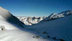 Im Pass leider sehr windig und recht frisch, deshalb gleich weiter. Abfahren in WNW Richtung, keine Spalten gesehen. Dann auf viele Spuren getroffen die auf den Witenwasserenstock und wieder runter führen. Entlang dieser Spuren abgefahren, unterhalb der Rotondohütte durch und nach einer grossen Pause dann "der Autobahn" entlang bis Realp.