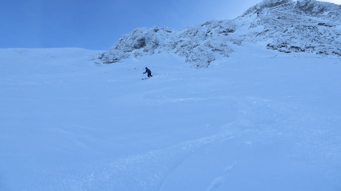 in der Abfahrt muss man dringend in den Coulis und Mulden mit Altschnee bleiben.