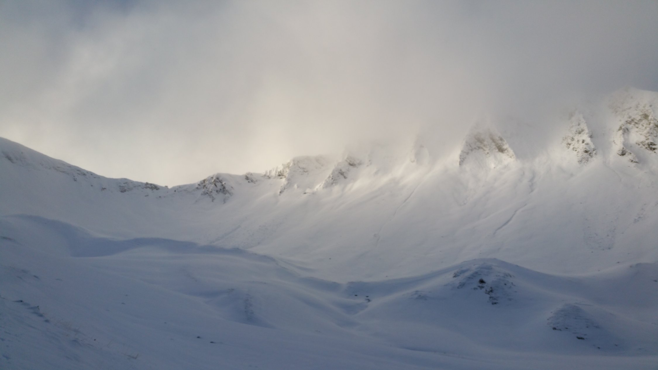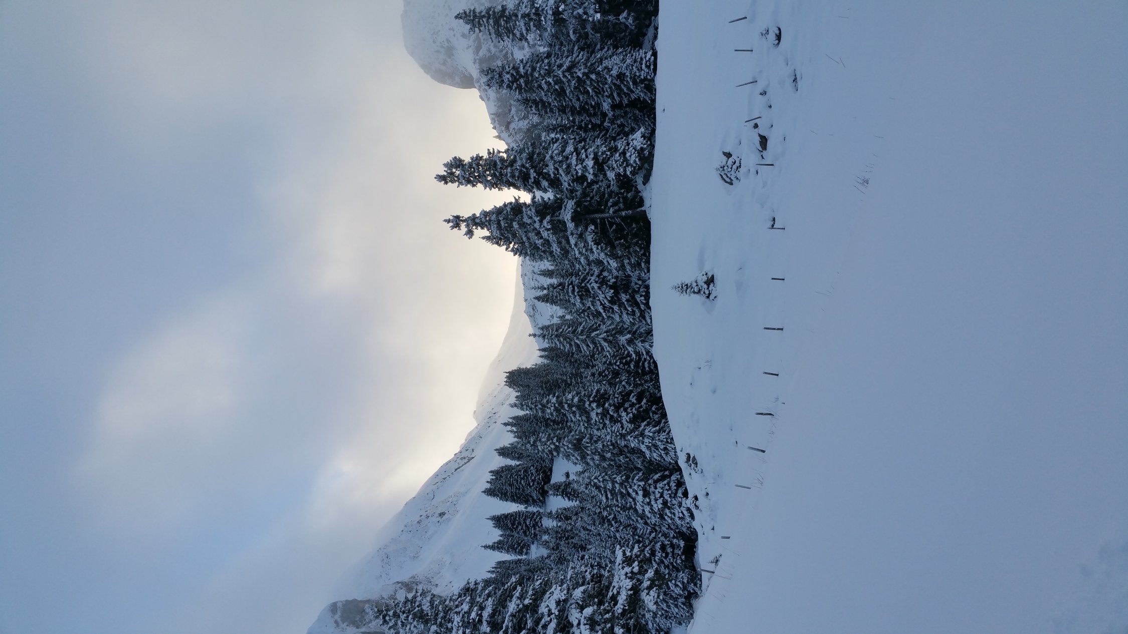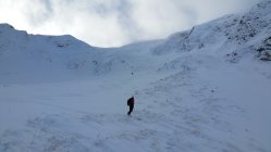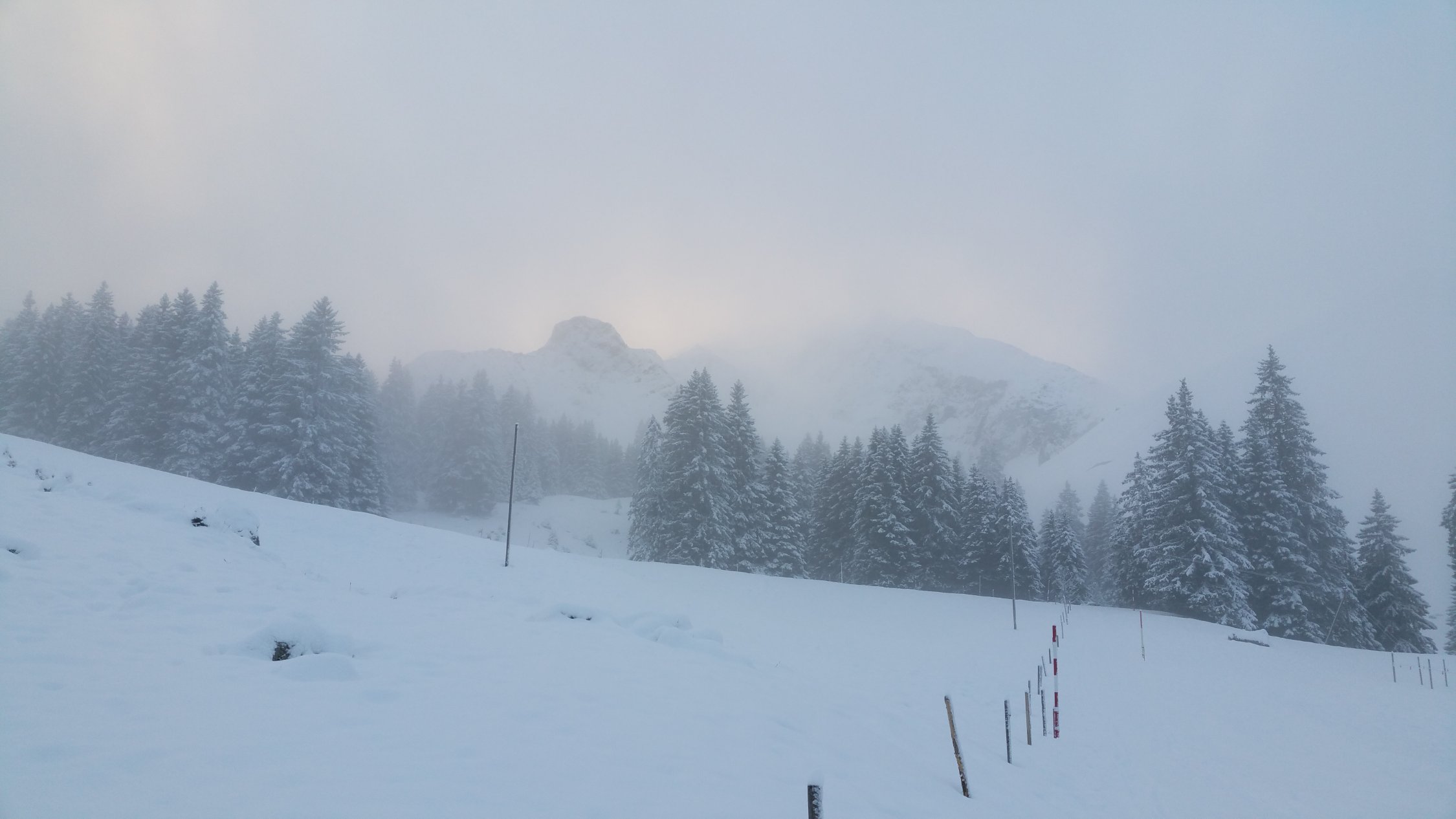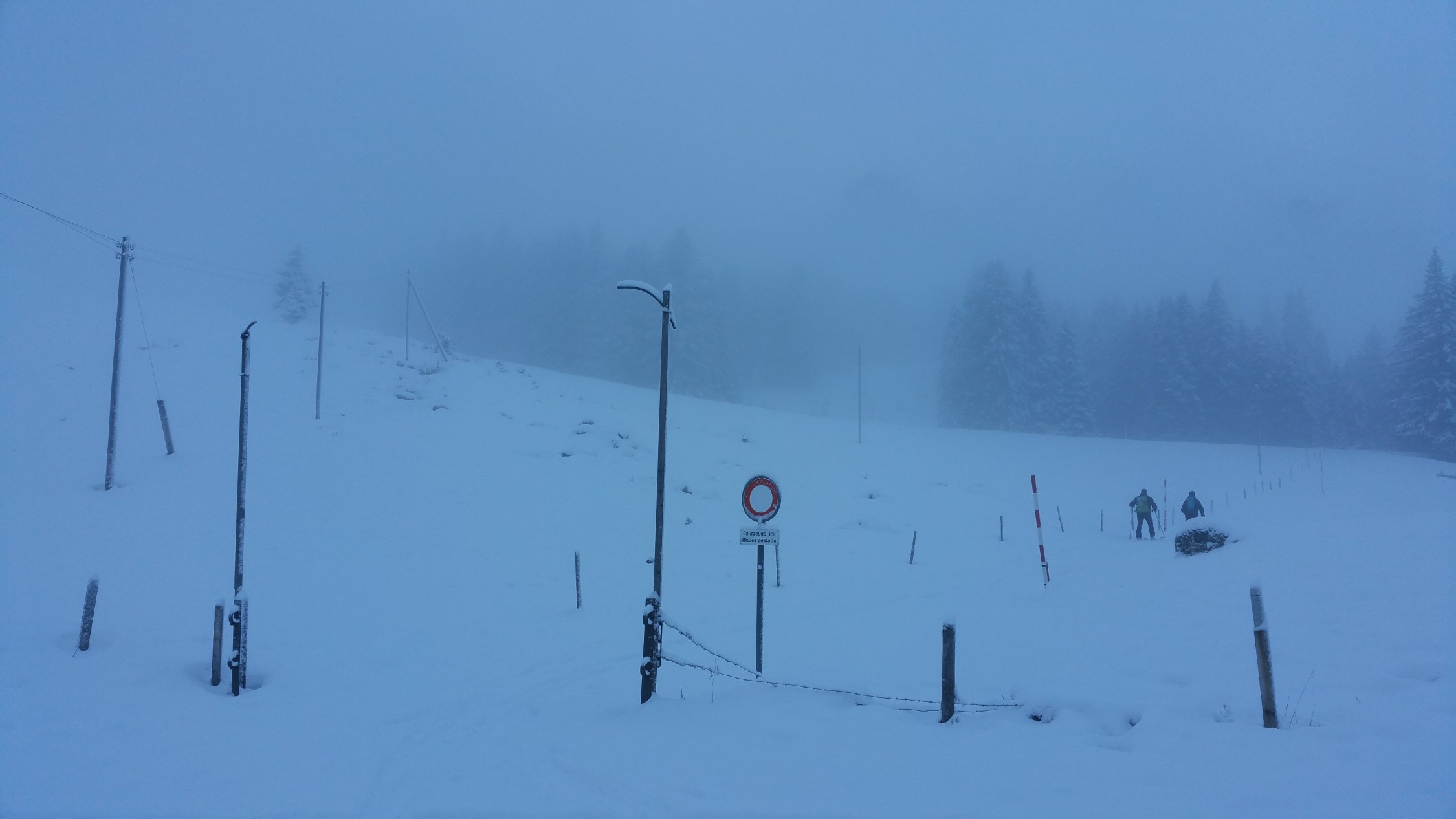 Rund 15cm pappiger Neuschnee auf dünner Unterlagen. Start im Nebel, der sich aber bald zu lichten begann. Abfahrt durch N-Flanke. Situation aufgrund der geringen Neuschneemenge unkritisch. Mit mehr Schnee wäre von einer Fahrt durch die N-Flanke abzuraten, da der Neuschnee gebunden und noch schlecht mit der harten Altschneeschicht verbunden ist.