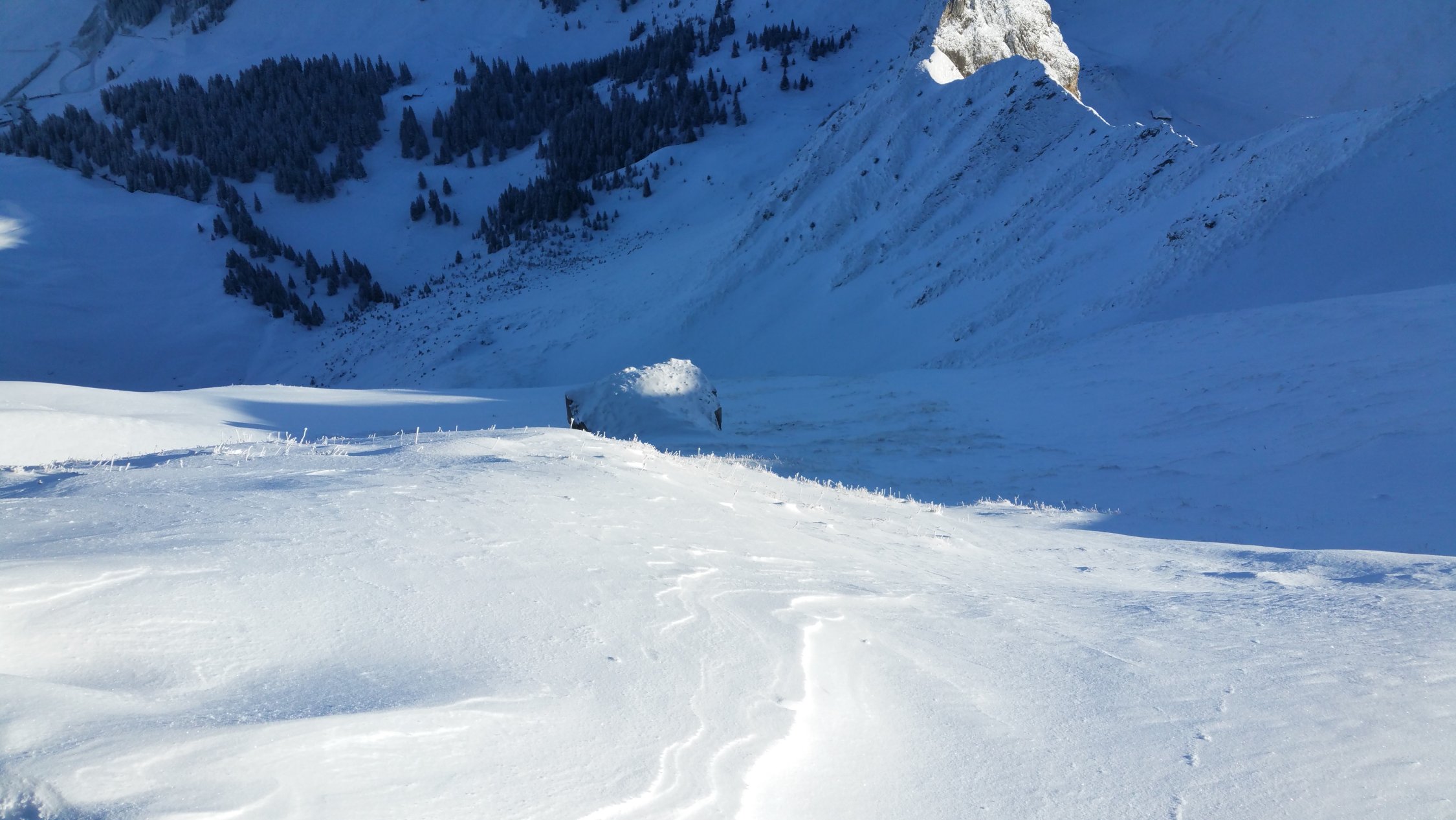 Durfte heute die erste Spur durch die N-Flanke legen. Die kurz nach mir auf dem Gipfel angekommenen 4 Tourenfahrer hatten ihre Felle schneller abmontiert als ich, liessen mir aber den Vortritt in der Abfahrt - vielen Dank für die nette Geste!